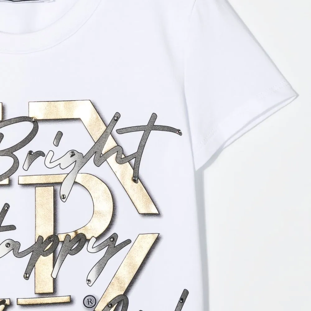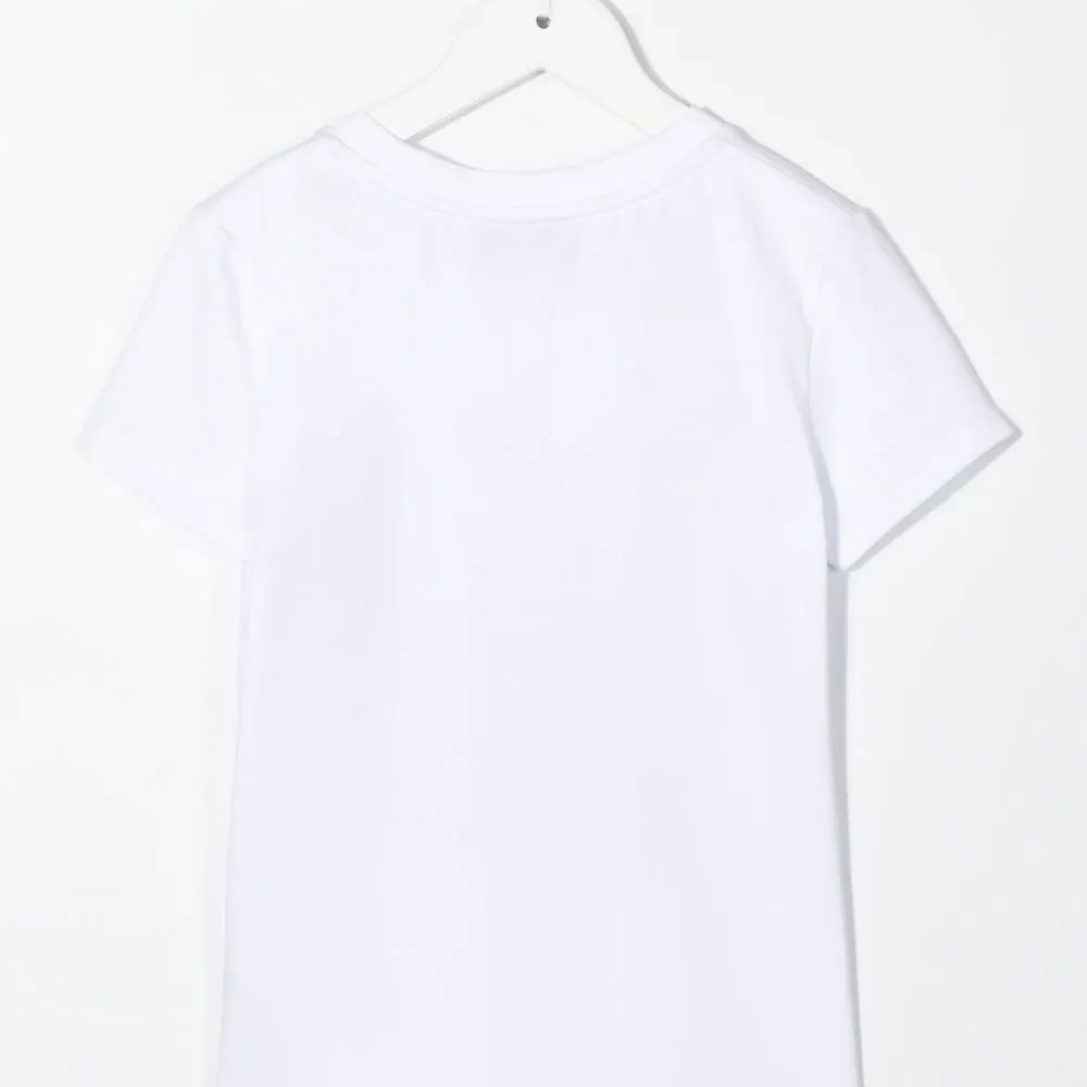 Белый, эластичный хлопок, ткань джерси, графичный принт спереди, круглый вырез, короткие рукава и прямой подол.