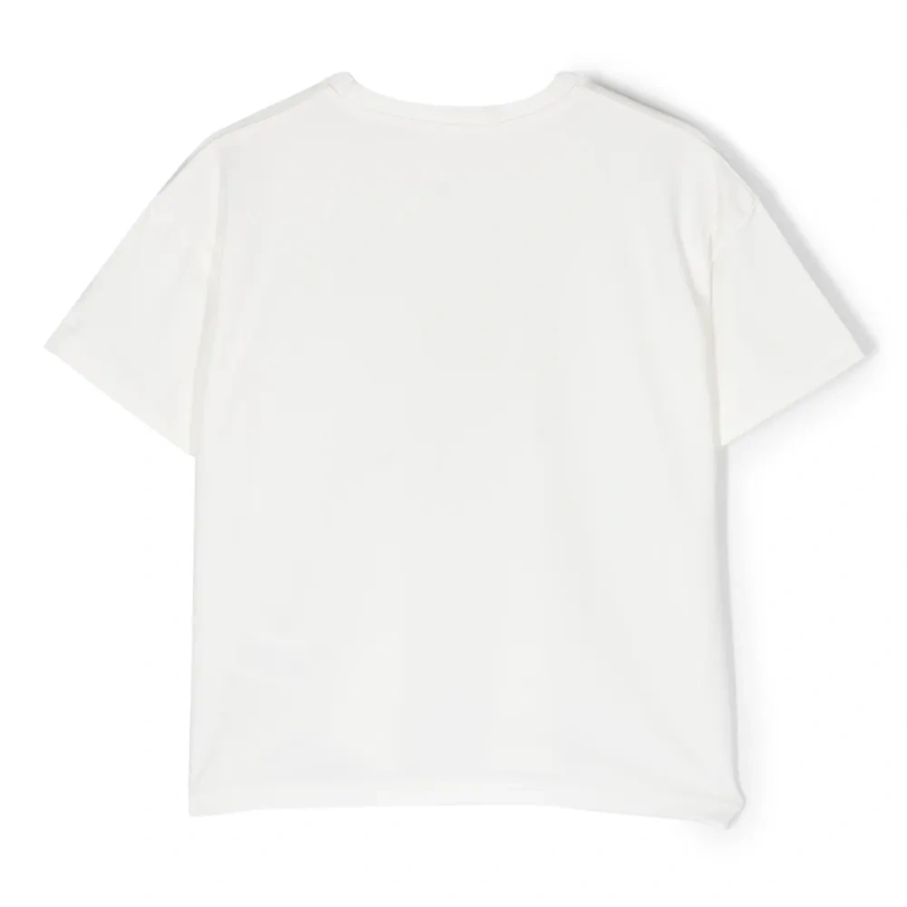 Кремовый, стрейчевый органический хлопок, графичный принт спереди, нашивка, круглый вырез, короткие рукава и прямой подол. Узнать больше о том, какие товары получают отметку «Ответственный выбор», можно из материала «Как мы оцениваем экологичность и этичность».