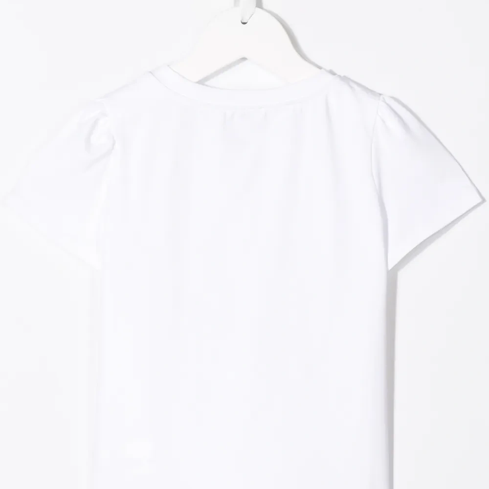 Футболка с аппликацией и оборками от Simonetta. Круглый вырез с окантовкой, узкий крой, прямой подол и короткие рукава. Цвет: белый.