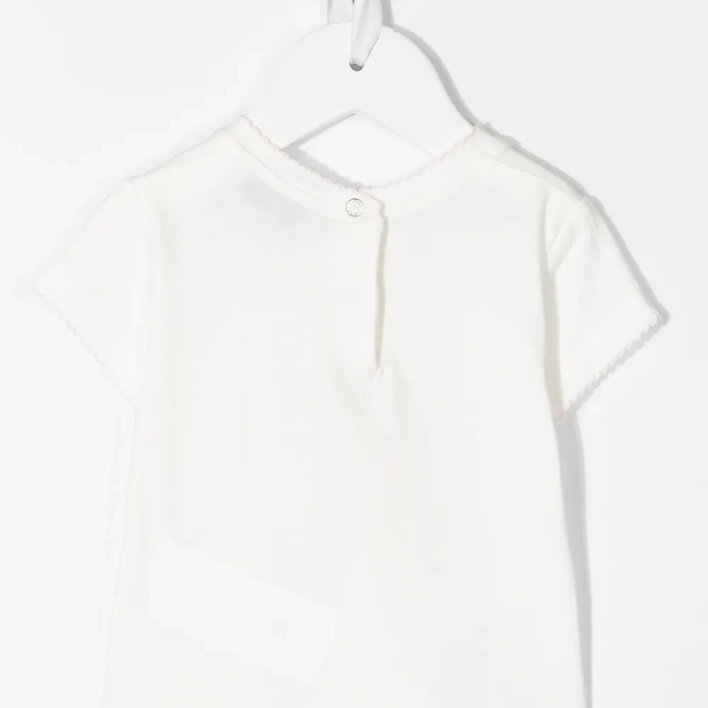 Графичный принт, круглый вырез, застежка на пуговицы сзади, короткие рукава и прямой подол.