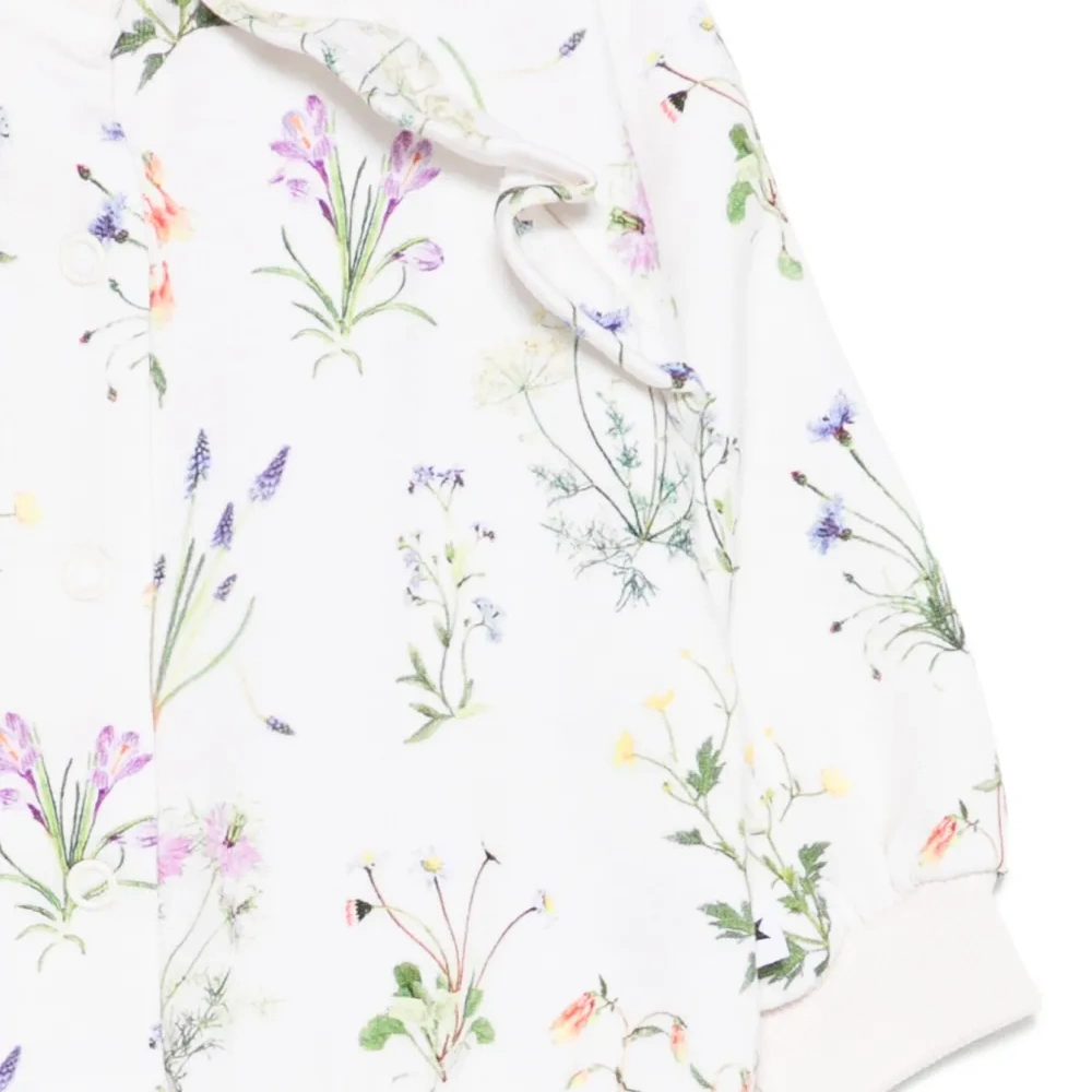 кремовый с цветочным принтом, оборками, застежками на кнопках, ребристыми манжетами и ребристым подолом