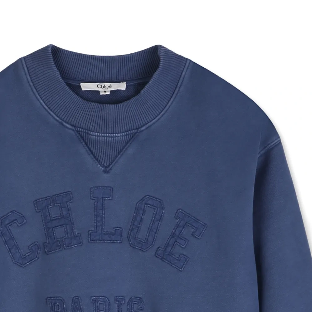 синий свитшот с тиснённым логотипом, ребристыми краями и манжетами, круглый вырез