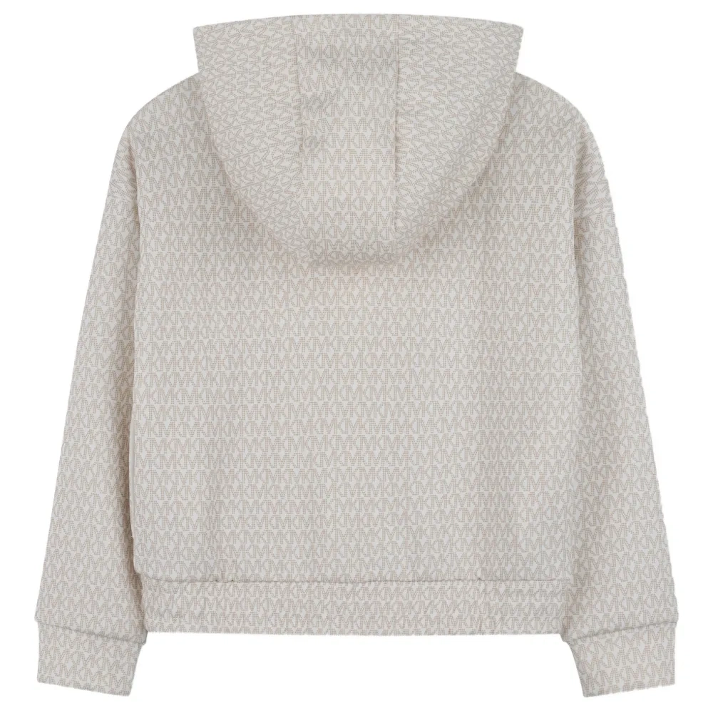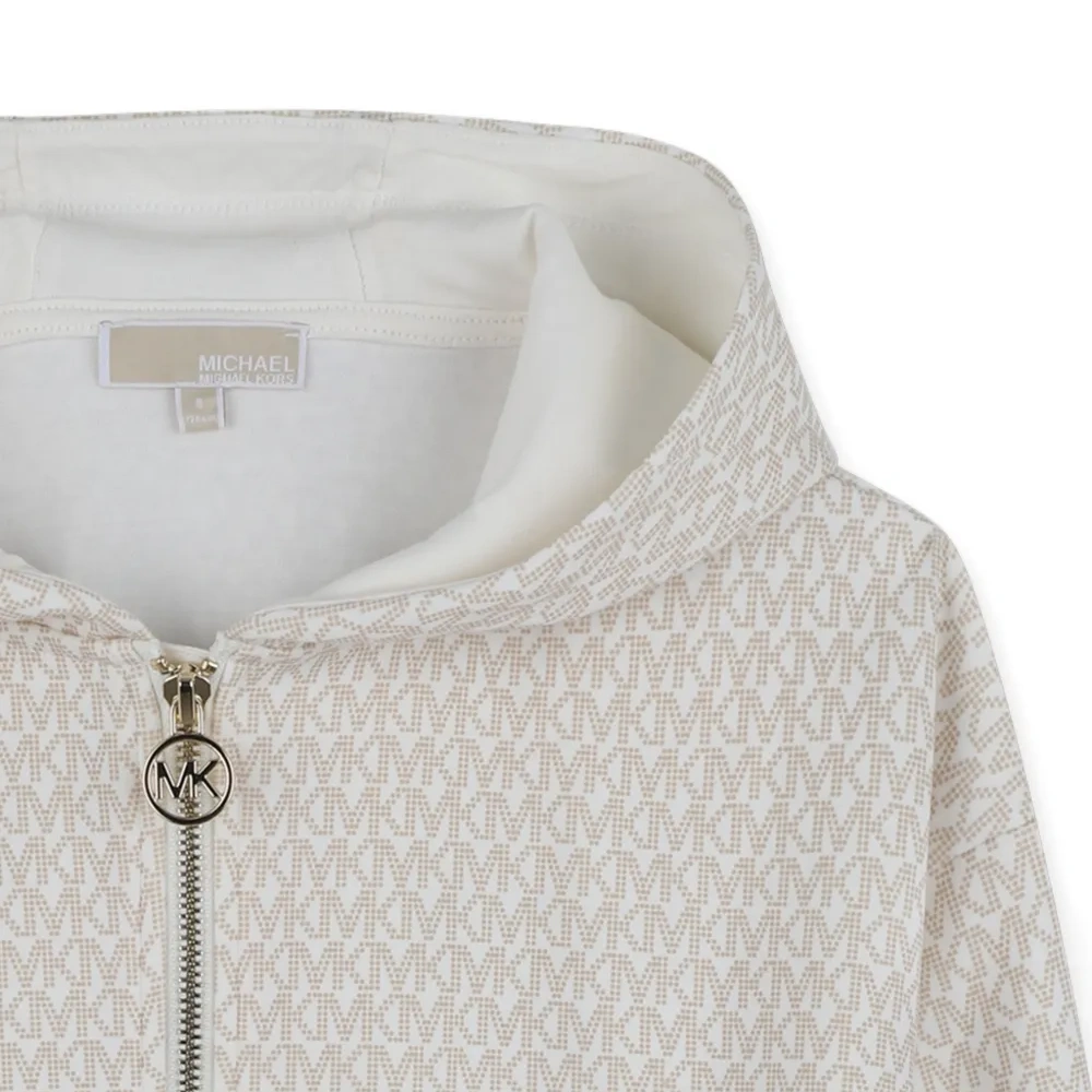 бежевый худи с застежкой-молнией спереди, принтом логотипа по всей поверхности, круглой подвеской-логотипом и длинными рукавами