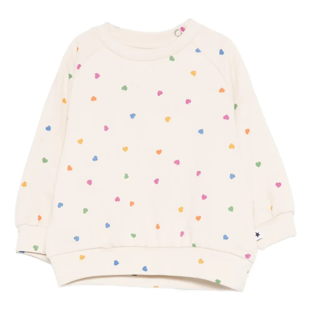 бежевый джемпер с принтом в виде сердец, круглым вырезом горловины, длинными рукавами, ребристым подолом и манжетами