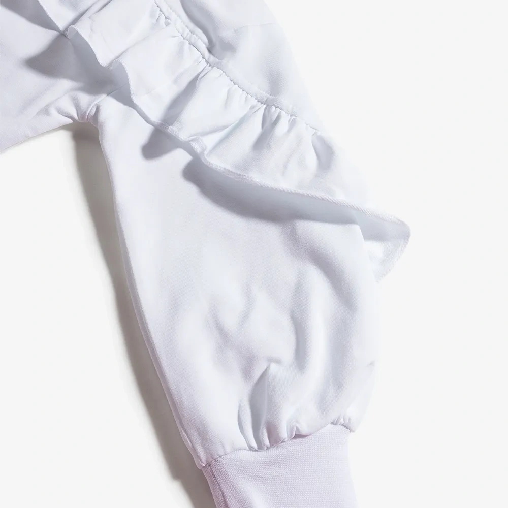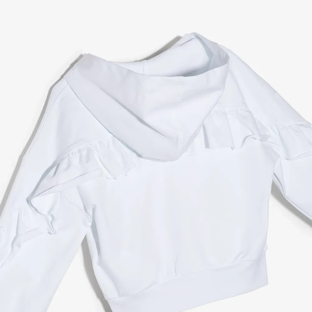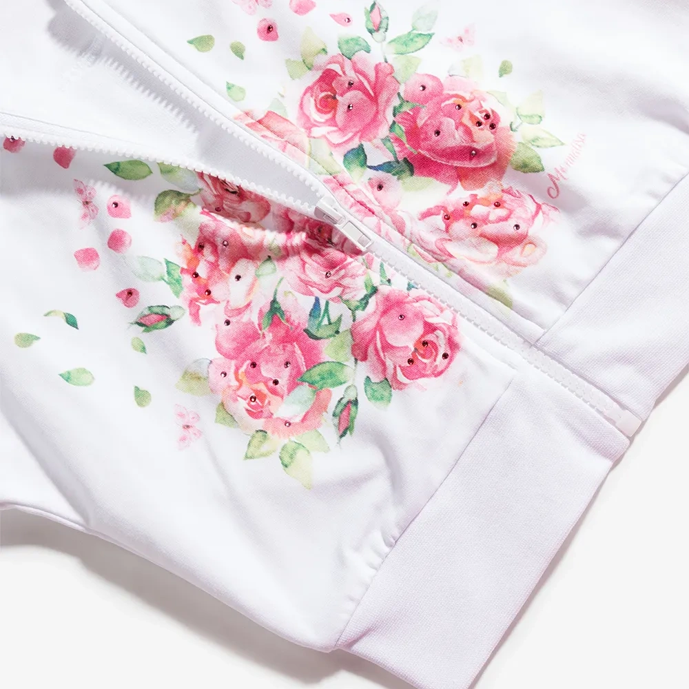 Принт с изображением роз спереди, вставки с оборками, застежка на молнии спереди, классический капюшон, длинные рукава, манжеты в рубчик и подол в рубчик. Цвет: белый.