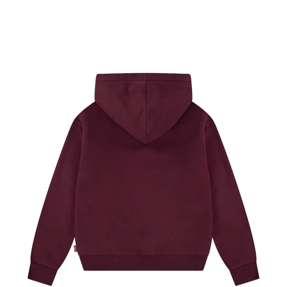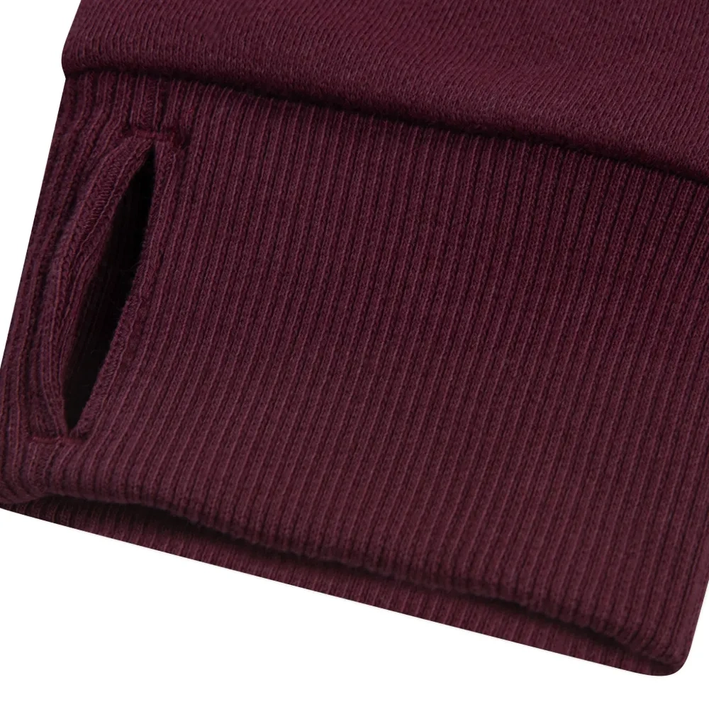 бордовый худи с нашивкой-логотипом, манжетами с отверстиями для больших пальцев, карманом-кенгуру, ребристым подолом и капюшоном