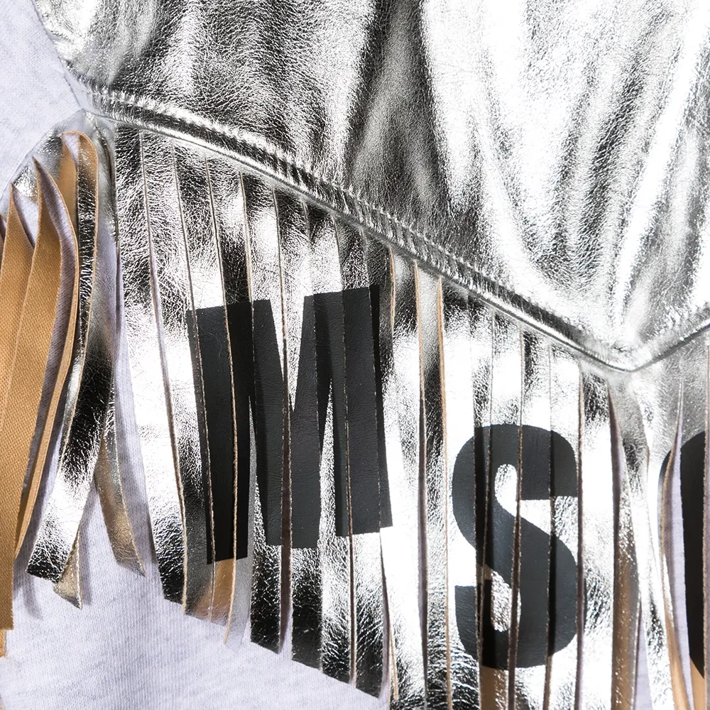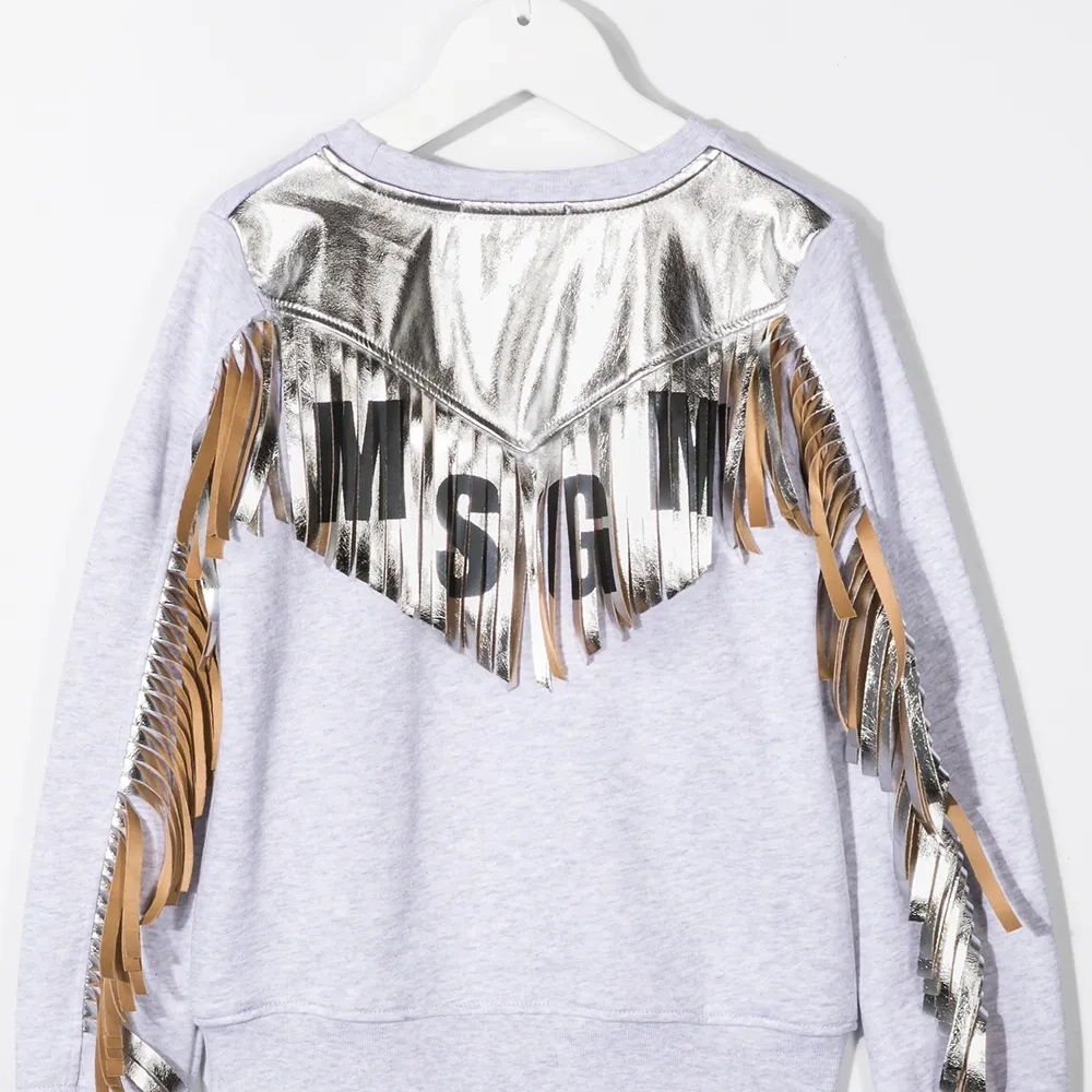 Круглый вырез, логотип спереди, длинные рукава и бахрома.
