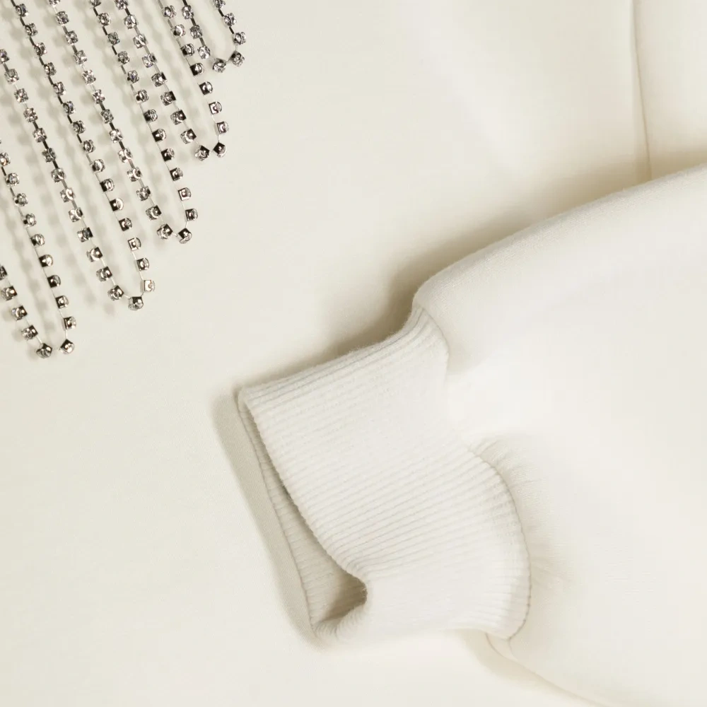 Кремовый, цепочка, серебристый металлический логотип, широкое горлышко, длинные рукава и прямой подол.