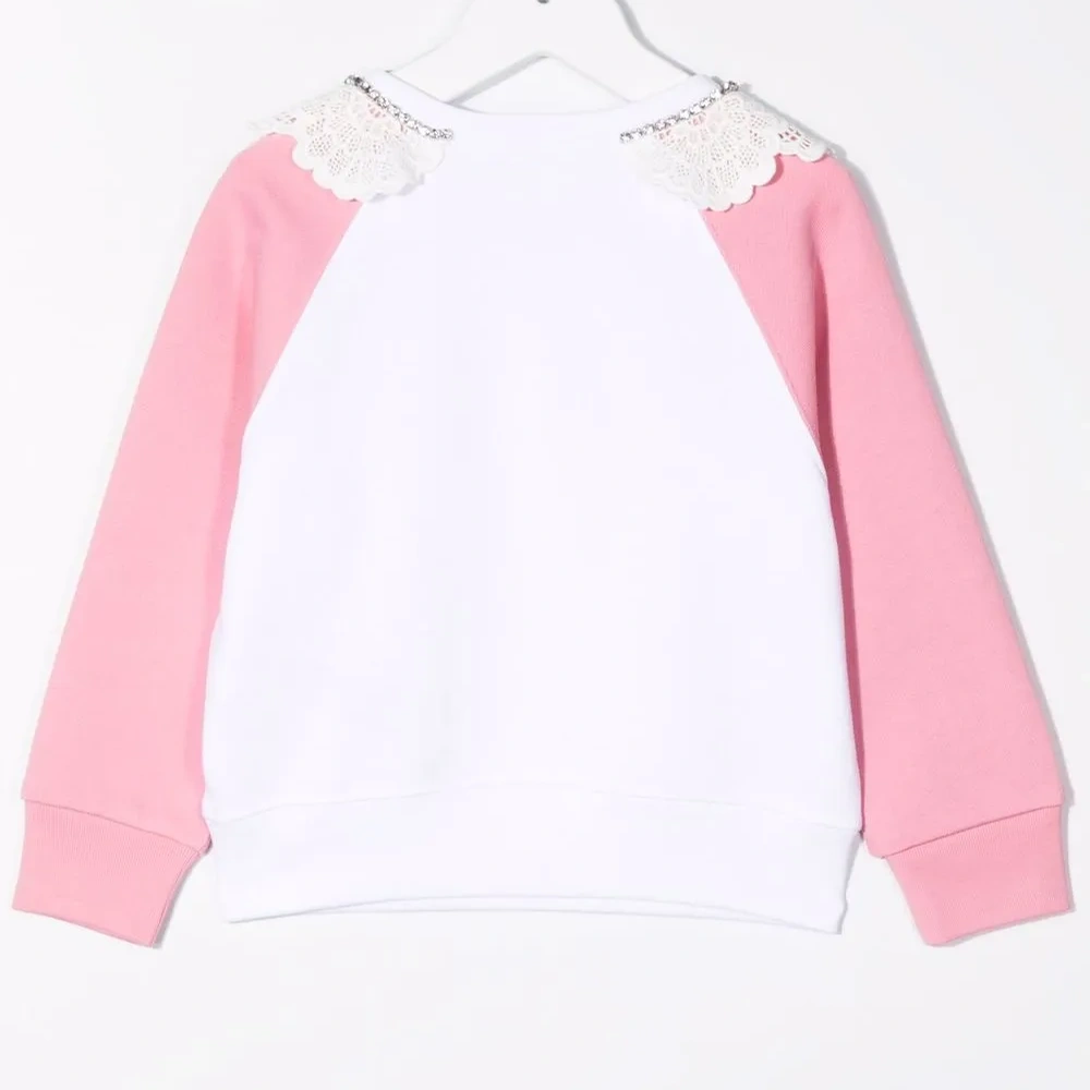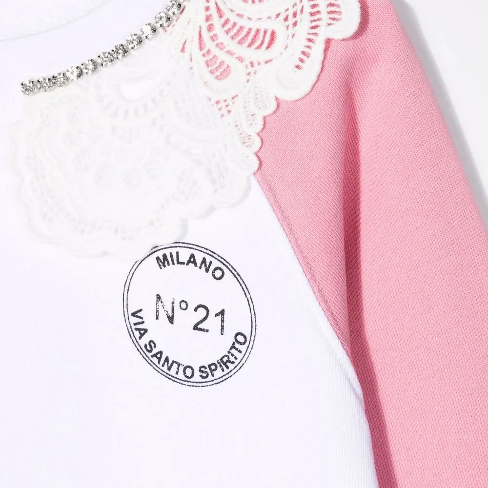 Принт с логотипом на груди, декор из кристаллов, кружевная отделка, круглый вырез и длинные рукава.