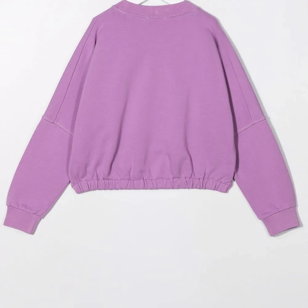 Принт с логотипом на груди, круглый вырез, длинные рукава и прямой подол.