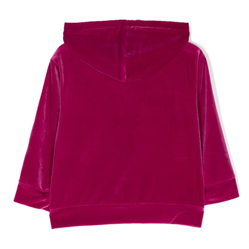 Фуксия, эластичный материал, отделка с изображением логотипа, застежка на молнии спереди, классический капюшон, длинные рукава и прямой подол.