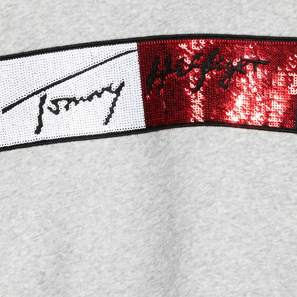 Логотип из пайеток, круглый вырез, длинные рукава и подол в рубчик. Цвет: серый.