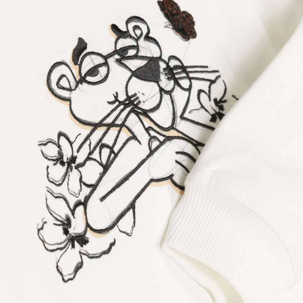 Белый, эластичный хлопок, вышитый узор, края в рубчик, длинные рукава и прямой подол.