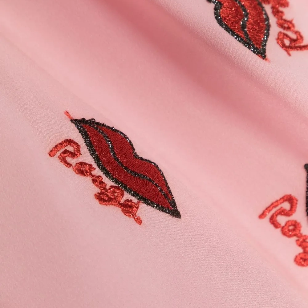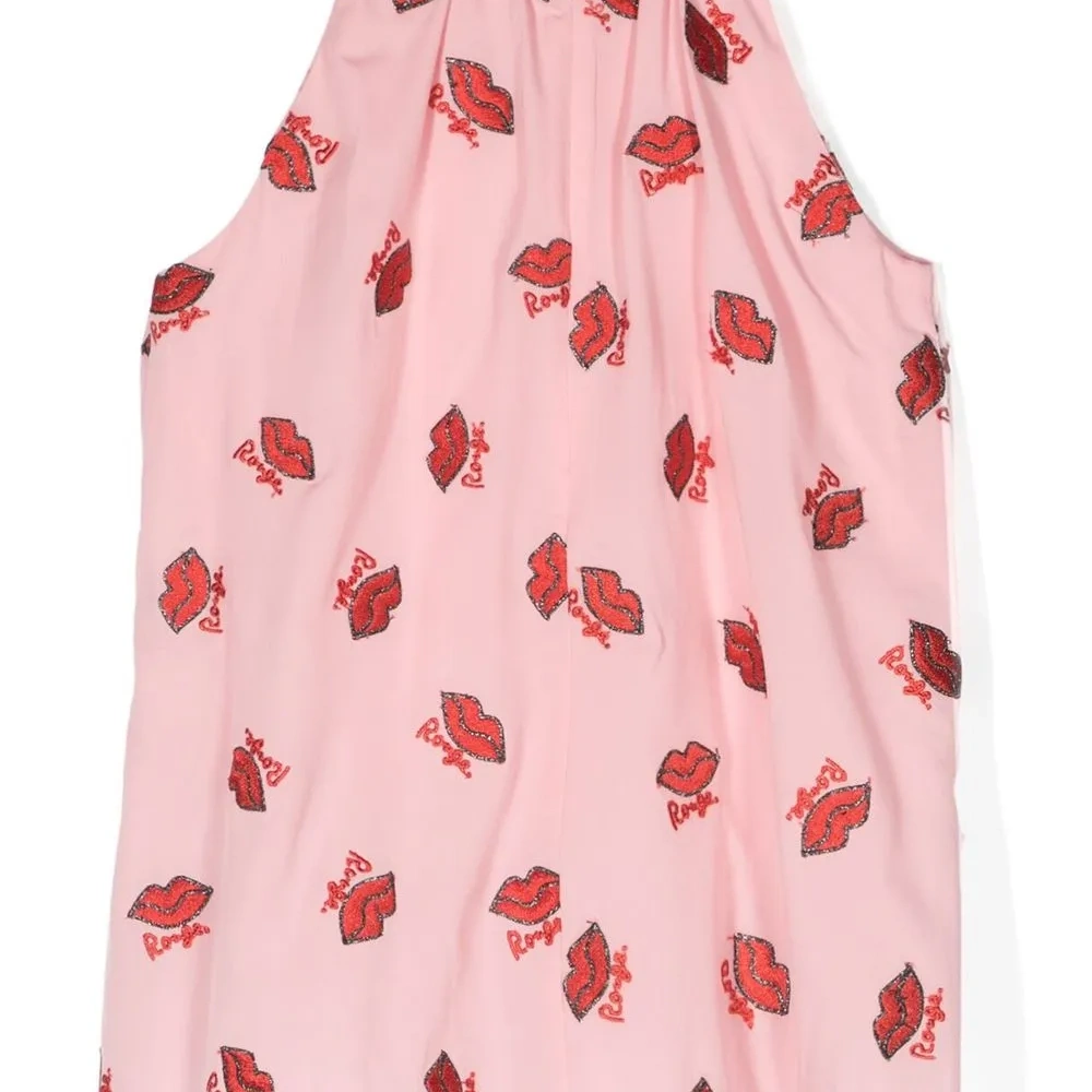 Сплошной графичный принт, узор с изображением губ, без рукавов, присборенный воротник, бант, металлический логотип, застежка на молнии сзади и прямой подол.