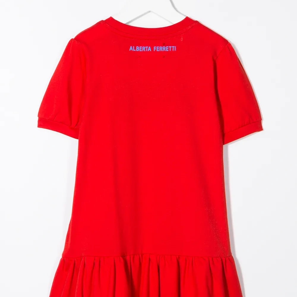 Платье из джерси I Love You от Alberta Ferretti Kids. Вышитая деталь, круглый вырез, короткие рукава, расклешенный силуэт и подол с рюшами. Цвет: красный.