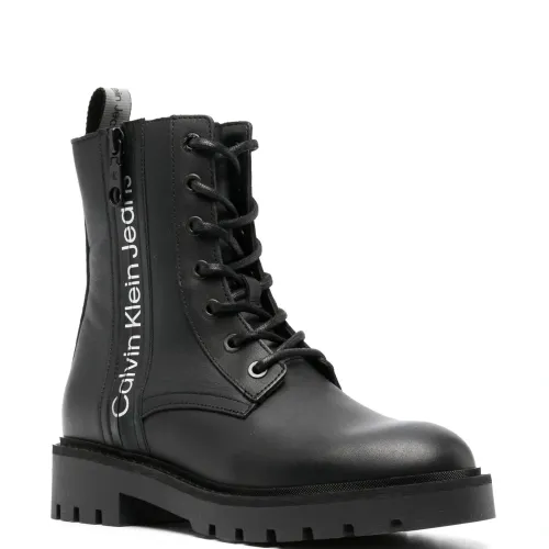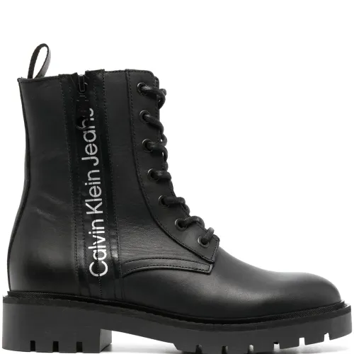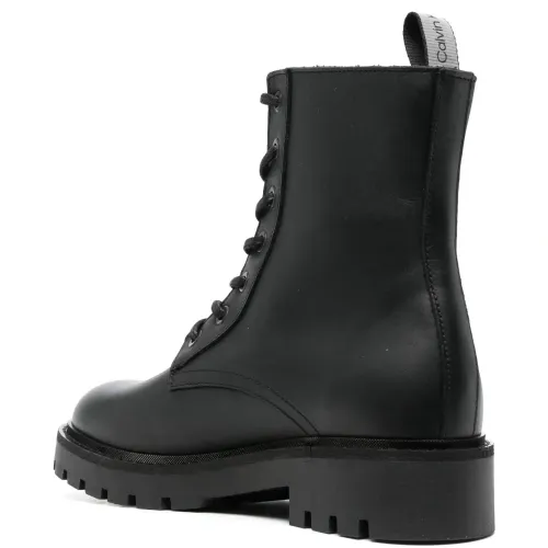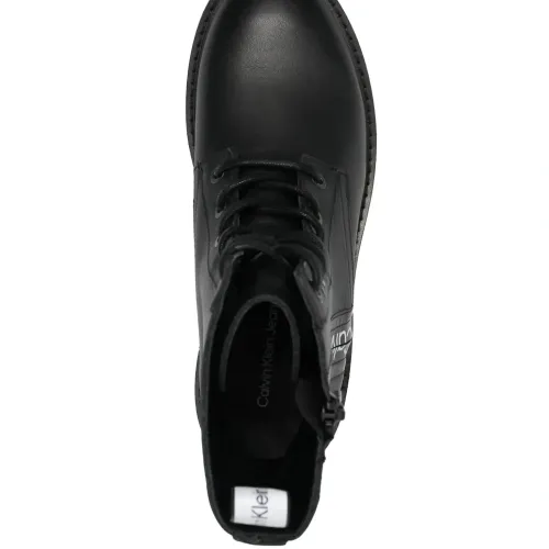 Черный, телячья кожа, логотип сбоку, закругленный носок, шнуровка спереди, застежка на молнии сбоку, петля для подтягивания сзади и массивная резиновая подошва.