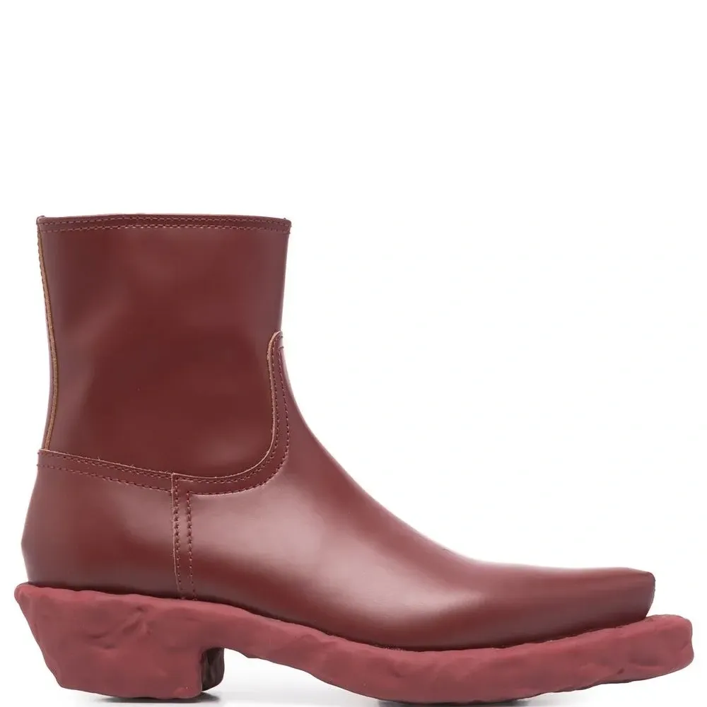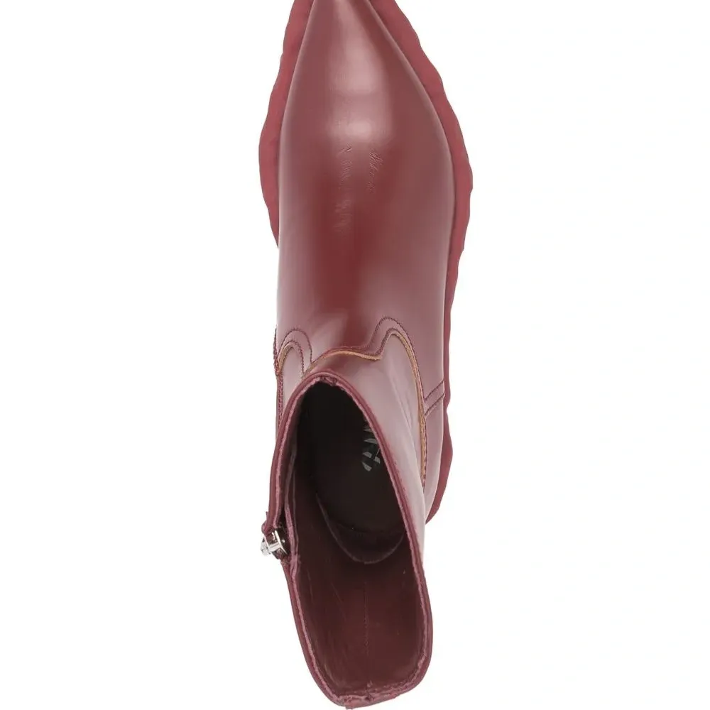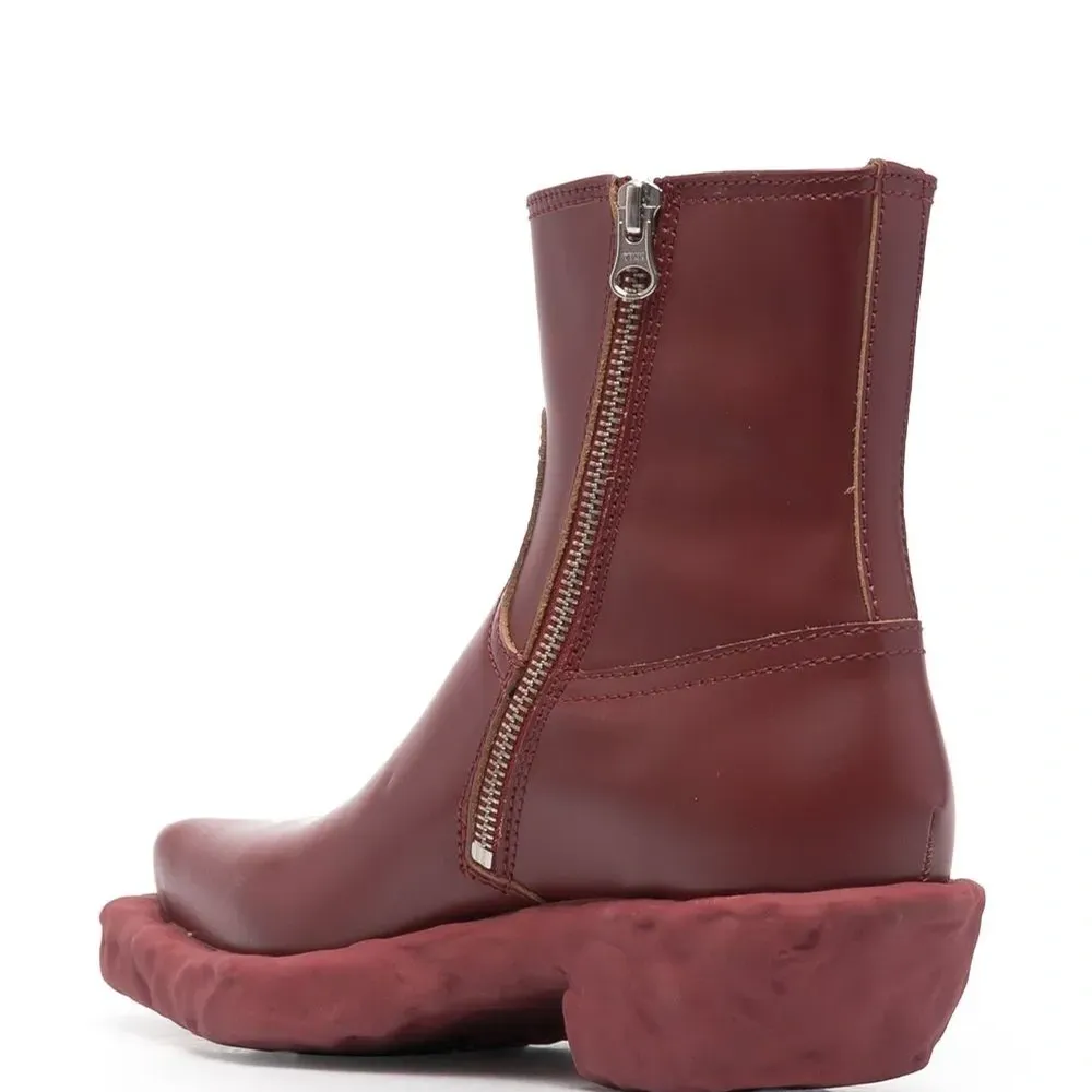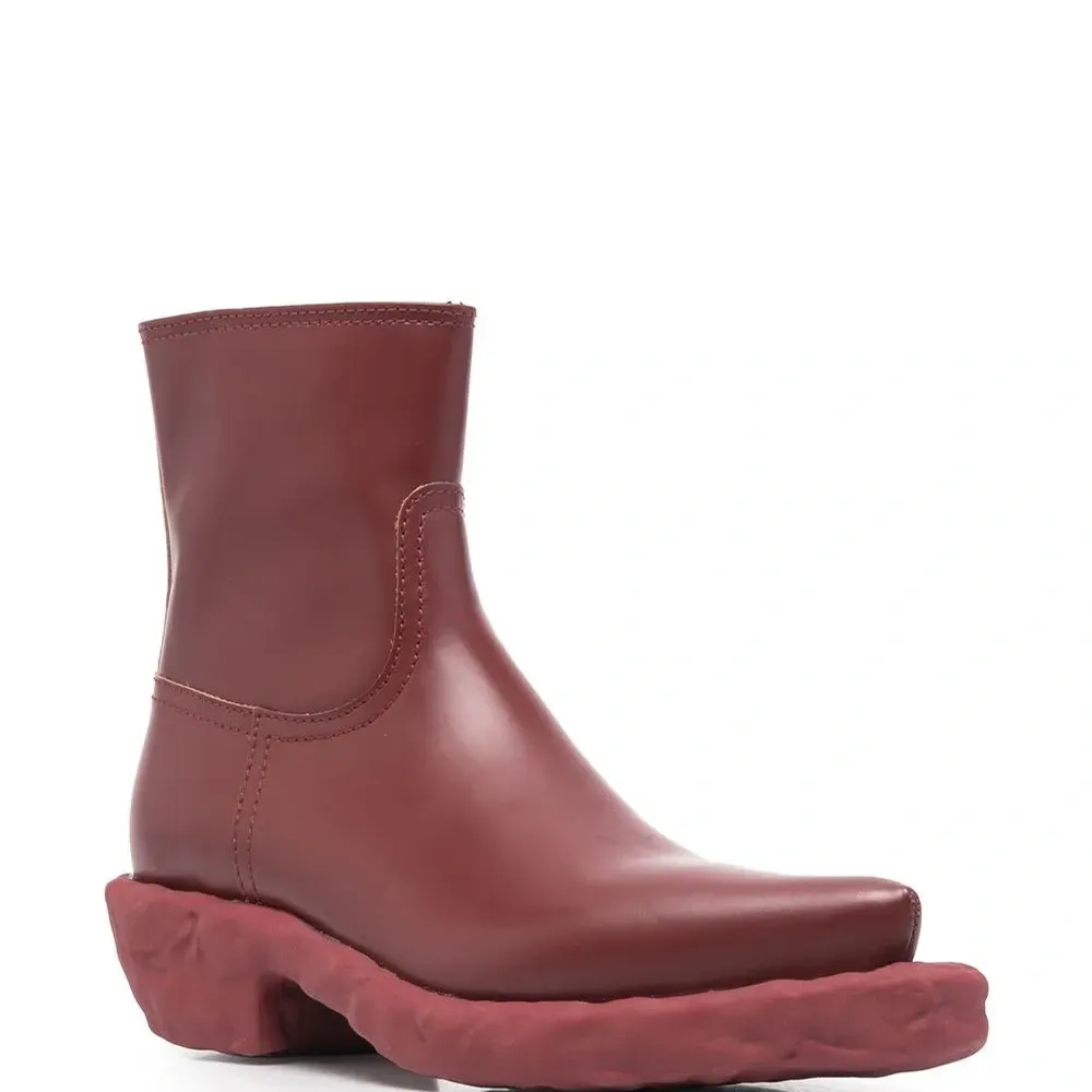 Бордовый, Кожа, низкий блочный каблук, длина по щиколотку и короткая застежка на молнии сбоку.