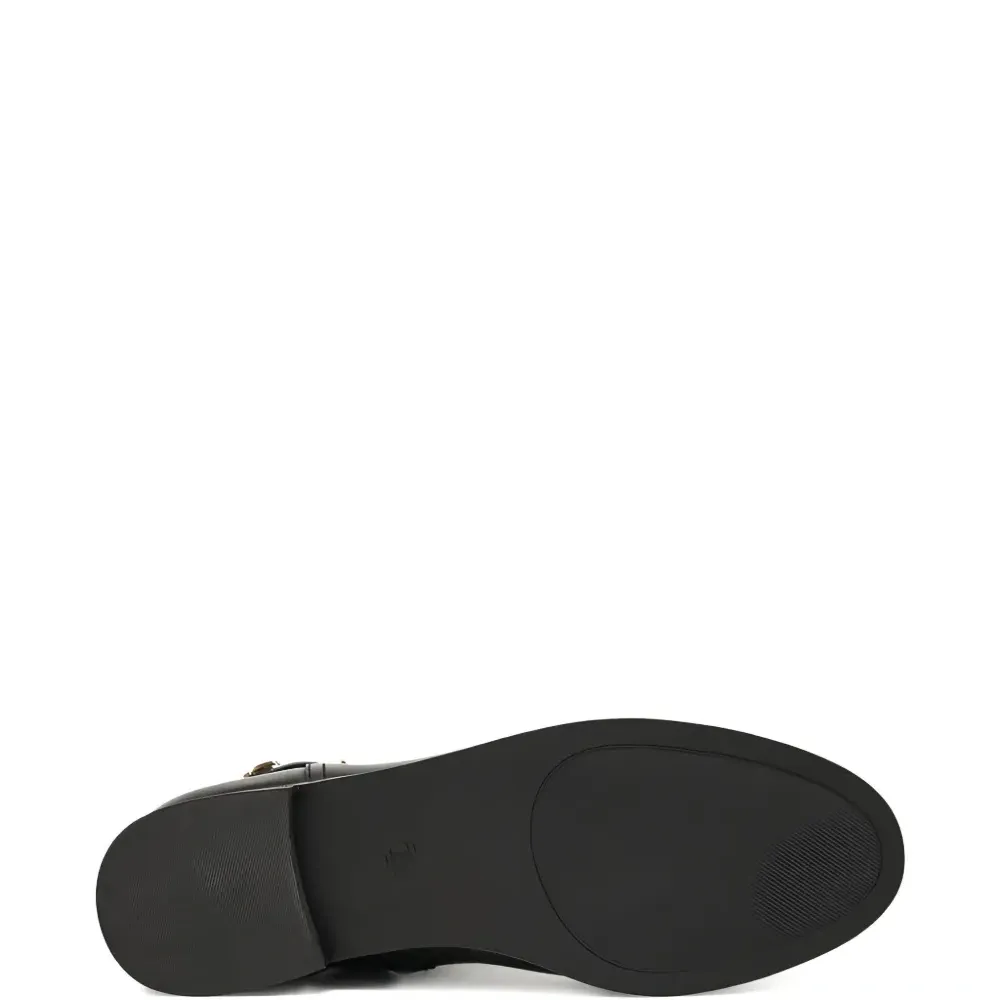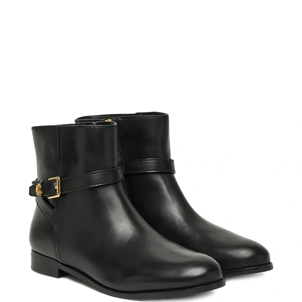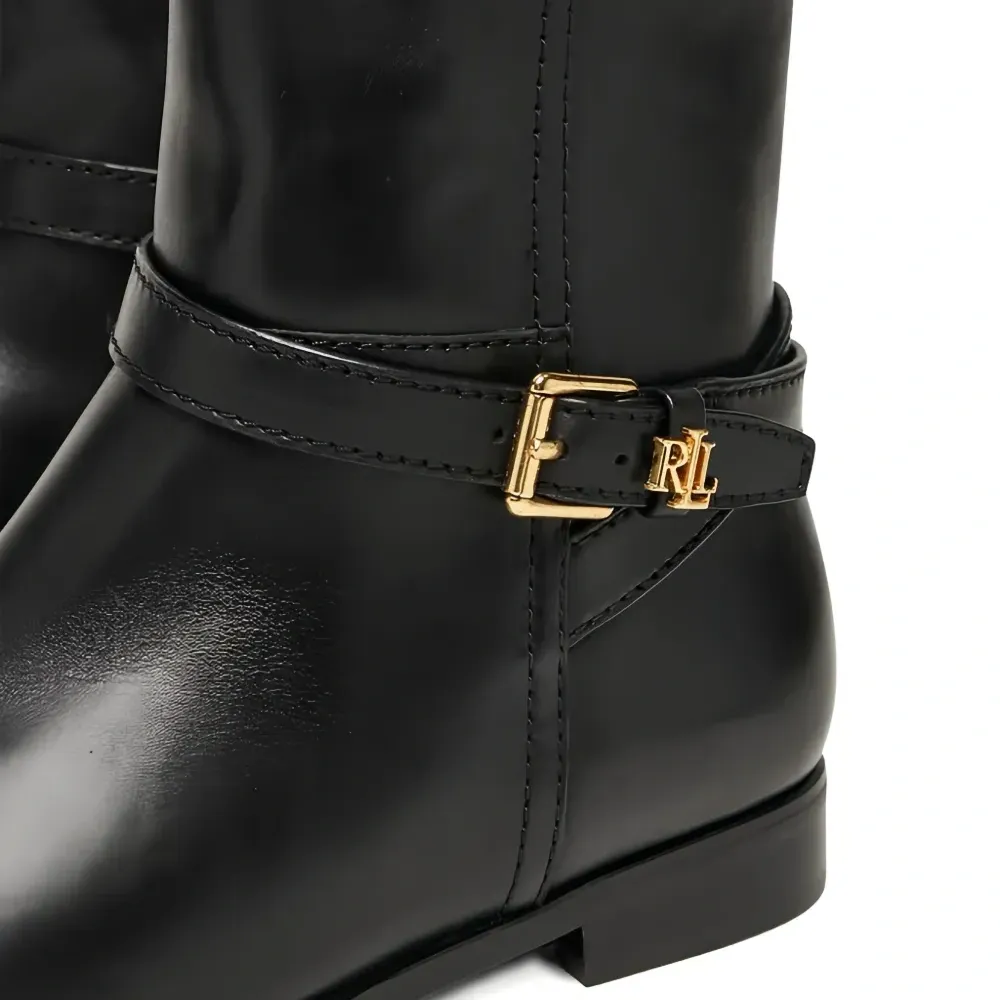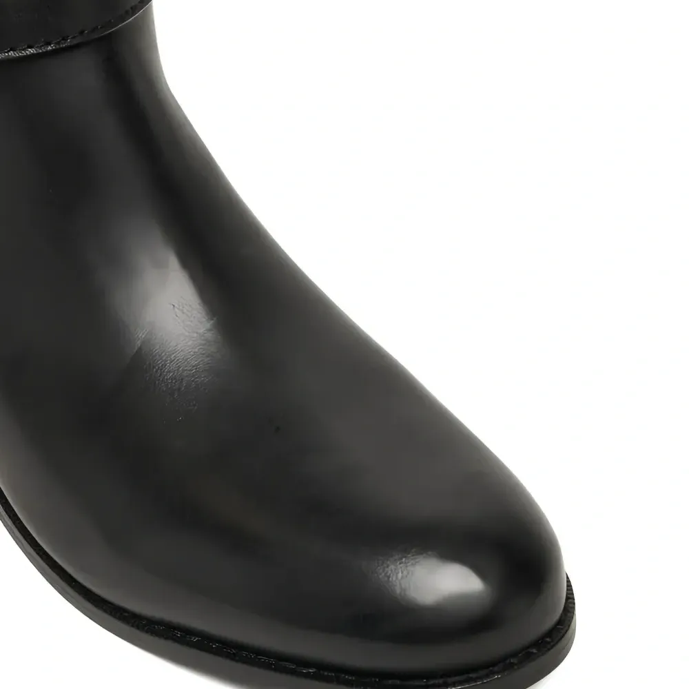 черная кожа, пряжка, фурнитура золотистого оттенка, боковая молния