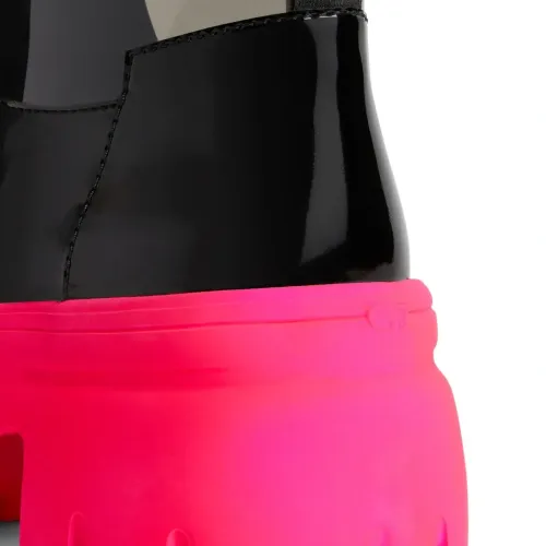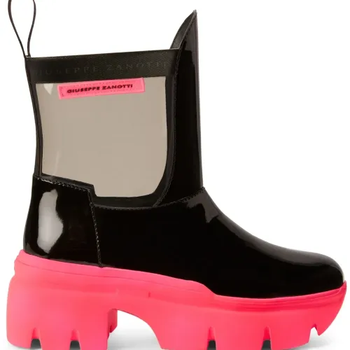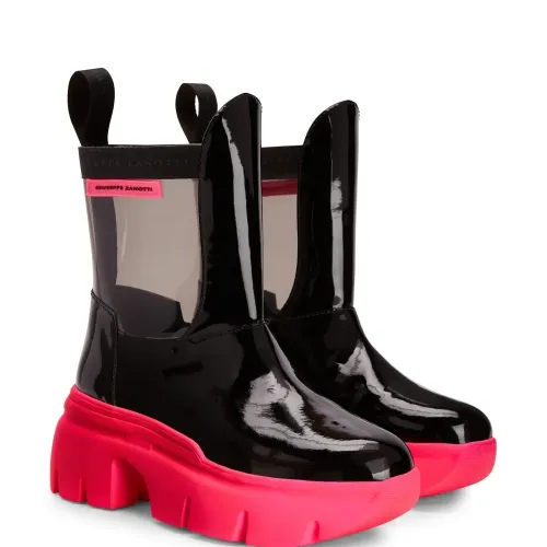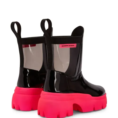 Черный, флуоресцентный розовый, лакированная отделка, прозрачный материал, нашивка с логотипом сбоку, ремешки с логотипом, петля для подтягивания сзади, закругленный носок, модель без застежки и массивная резиновая подошва.