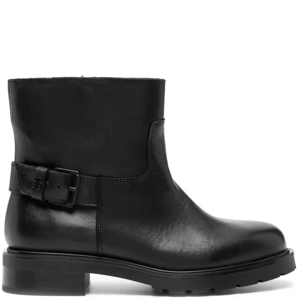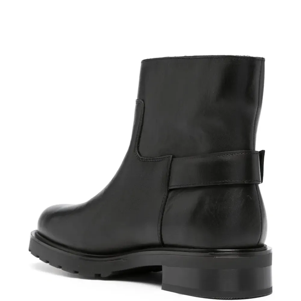 Черный, телячья кожа, строчка в тон, фурнитура в тон, декоративная пряжка, миндалевидный носок, модель без застежки, кожаная стелька с логотипом, резиновая подошва и высота по щиколотку.