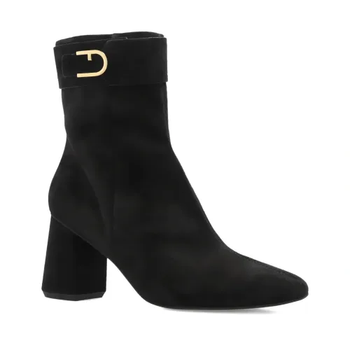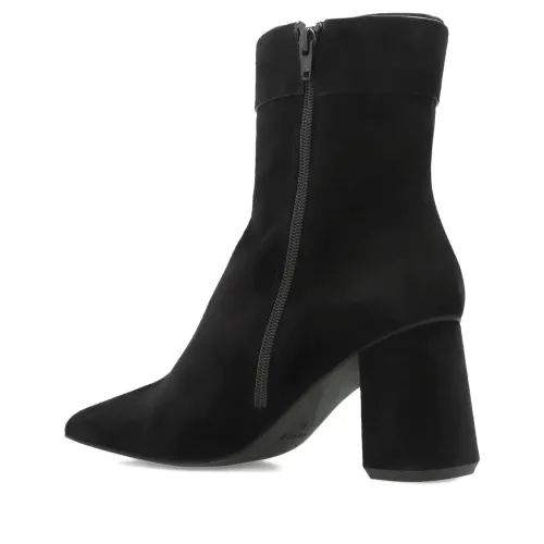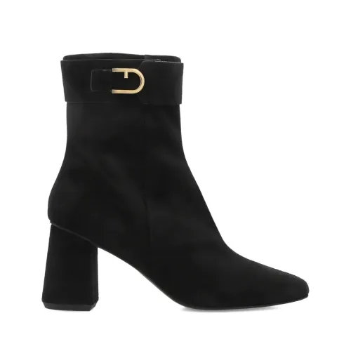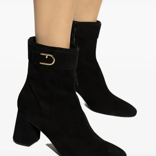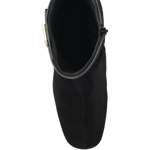 черные ботильоны на блочном каблуке с боковой молнией, золотистой фурнитурой и ремешком на щиколотке