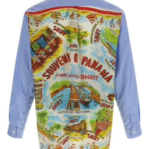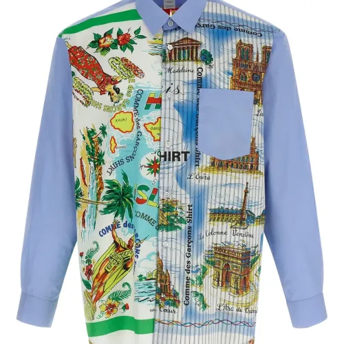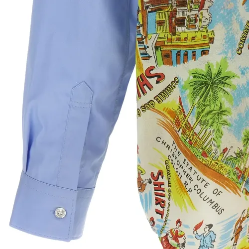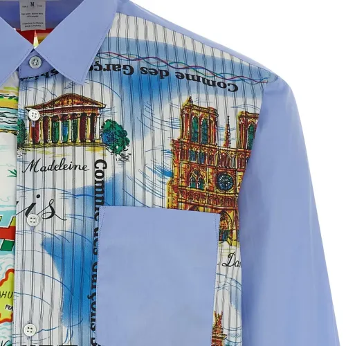 светло-голубой хлопок принты спереди и сзади застежка на пуговицы нагрудный карман длинные рукава с манжетами