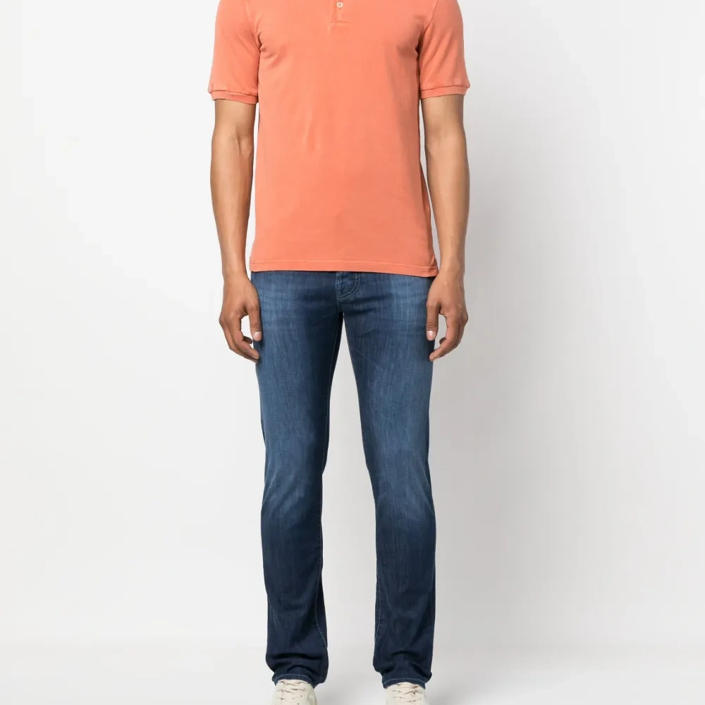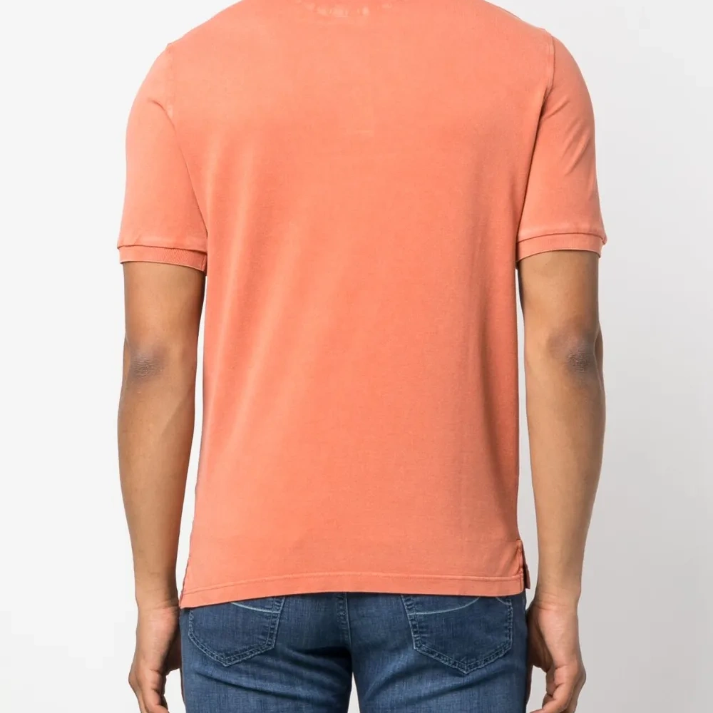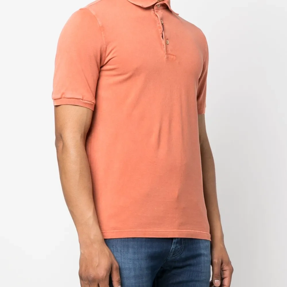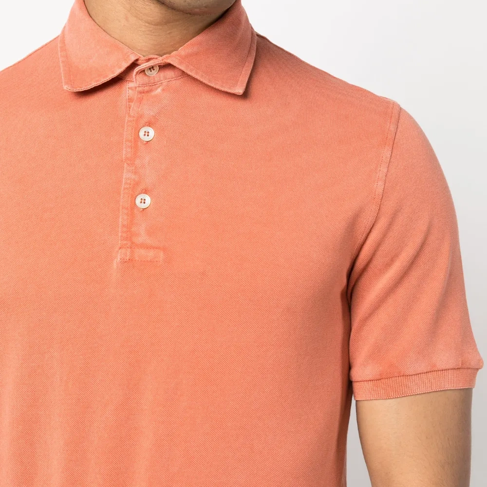 Персиково-оранжевый, хлопок, ткань джерси, воротник поло, короткая застежка на пуговицах спереди, короткие рукава и прямой подол.