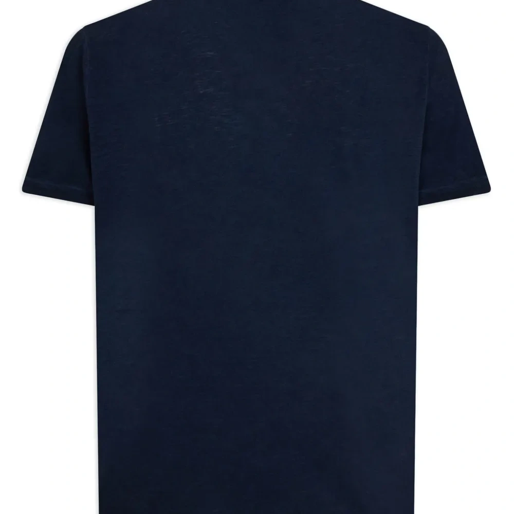 Темно-синий, смесовый хлопок, эффект меланж, принт с логотипом на груди, воротник поло, короткая застежка на пуговицах спереди и короткие рукава.