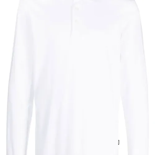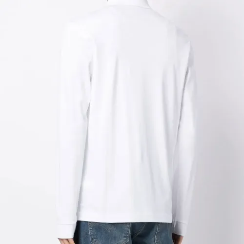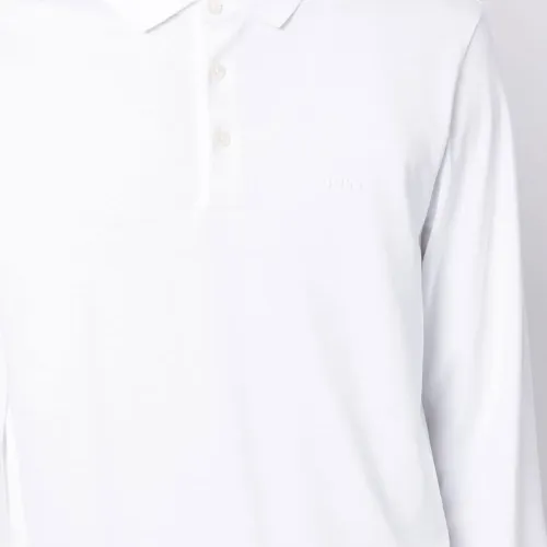 Белый, хлопок, вышитый логотип на груди, нашивка с логотипом сбоку, воротник поло, короткая застежка на пуговицах спереди и длинные рукава.