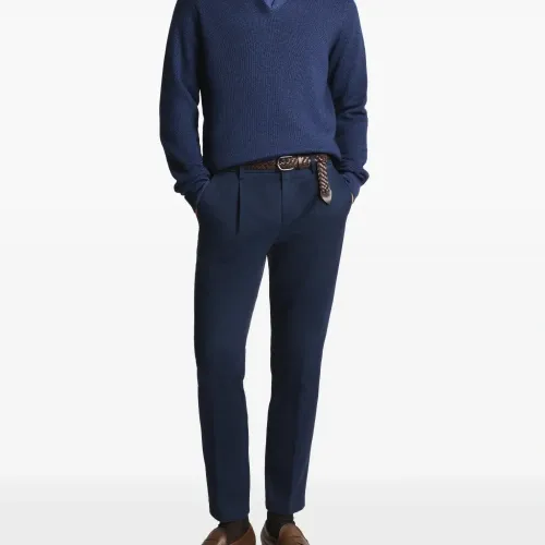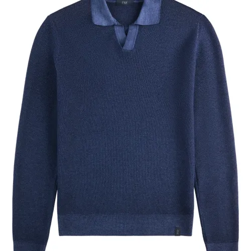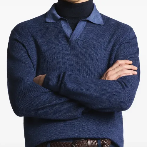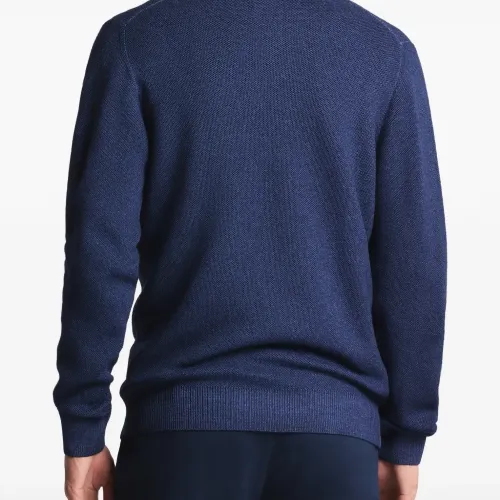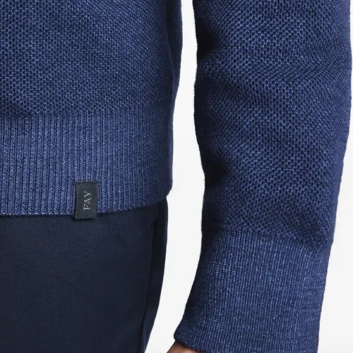синий вязаный узором "соты" джемпер с V-образным вырезом, длинными рукавами, однотонным воротником и ребристым краем