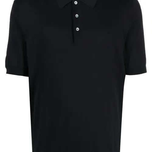 Темно-синий, хлопок, тонкая вязка, воротник поло, планка на пуговицах спереди, короткие рукава и прямой подол.