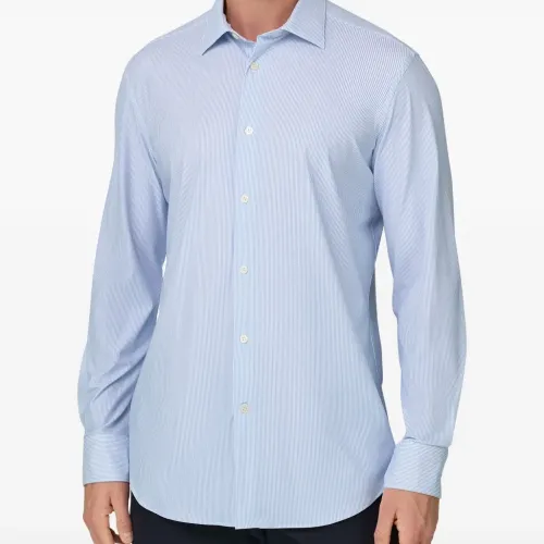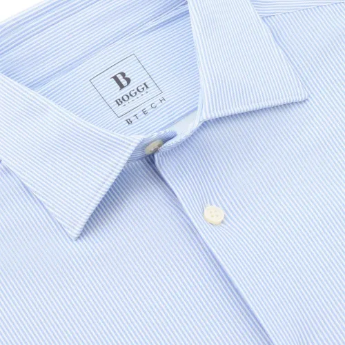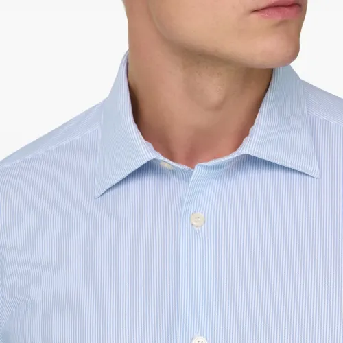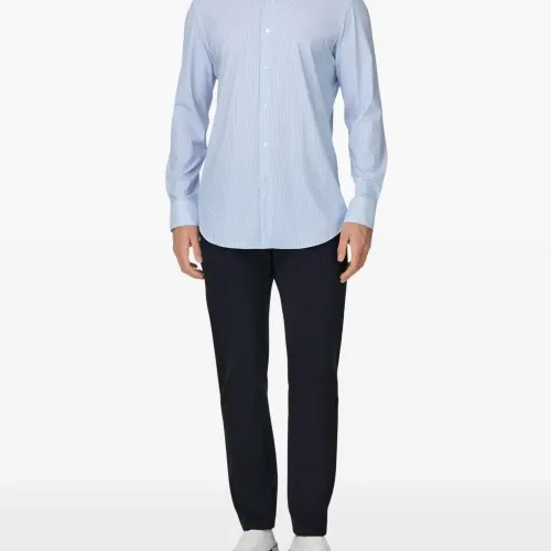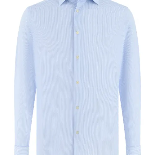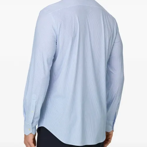 светло-голубая рубашка в полоску с воротником «Токио», застёжкой на пуговицы, длинными рукавами и текстурой «пике»
