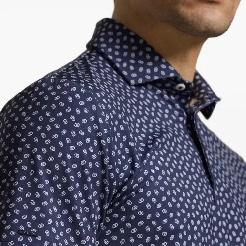 тёмно-синяя рубашка с узором, короткими рукавами, застежкой на пуговицы и классическим воротником