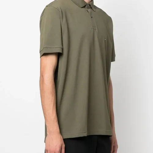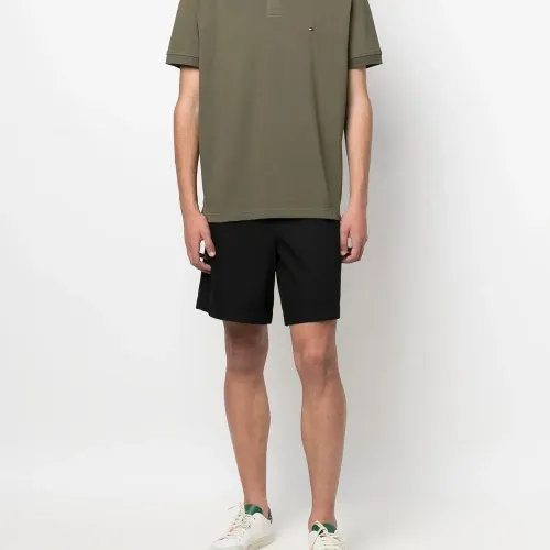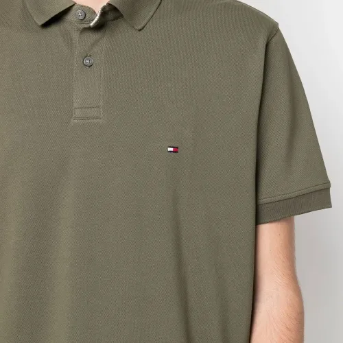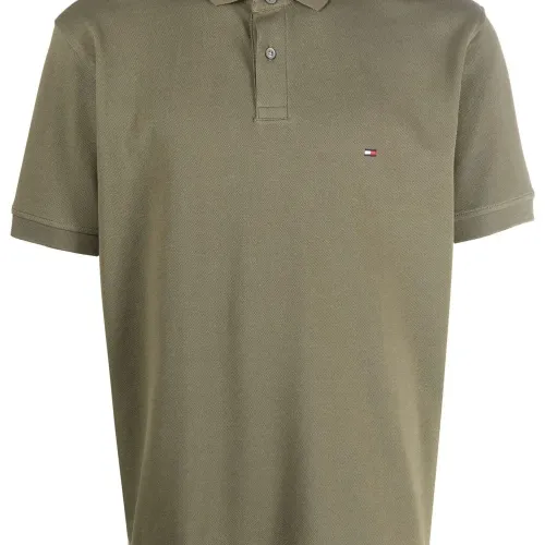 Зеленый, эластичный хлопок, вышитый логотип на груди, классический воротник, короткая застежка на пуговицах спереди, короткие рукава и прямой подол.