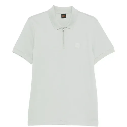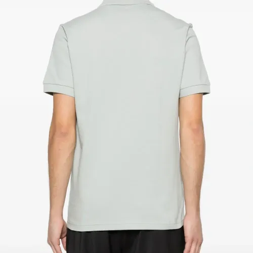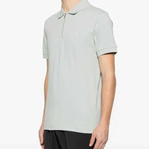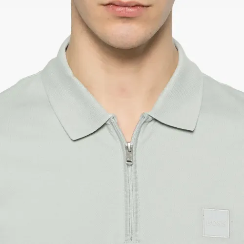 светло-серая хлопковая футболка-поло с короткими рукавами, молнией, нашивкой с логотипом, воротником-поло и ребристой отделкой