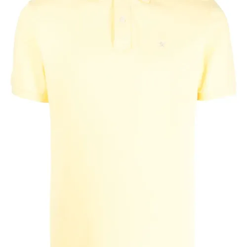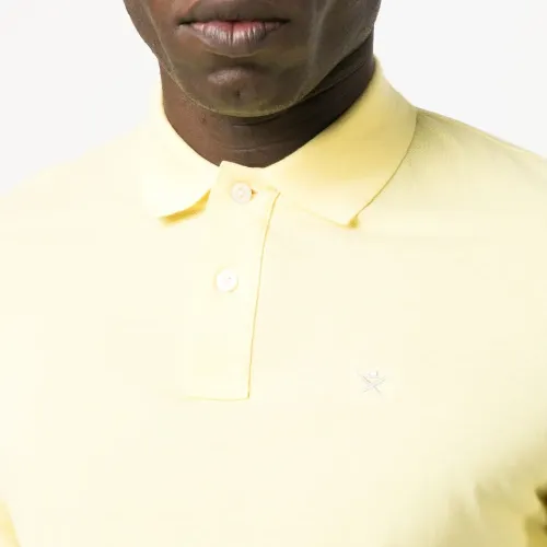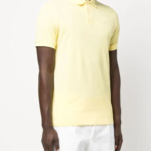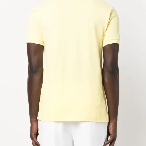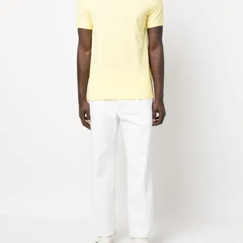 Светло-желтый, хлопок, вышитый логотип на груди, воротник поло, короткие рукава, планка на пуговицах спереди и прямой подол.