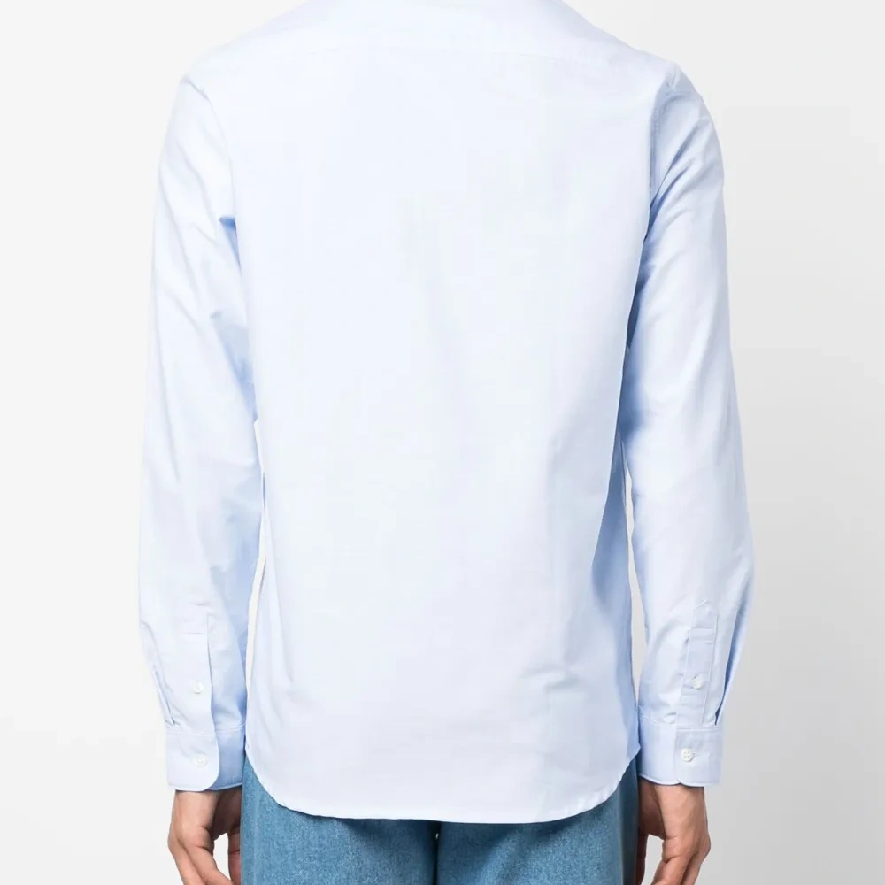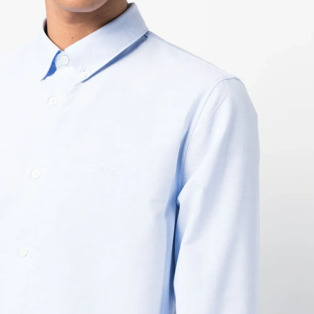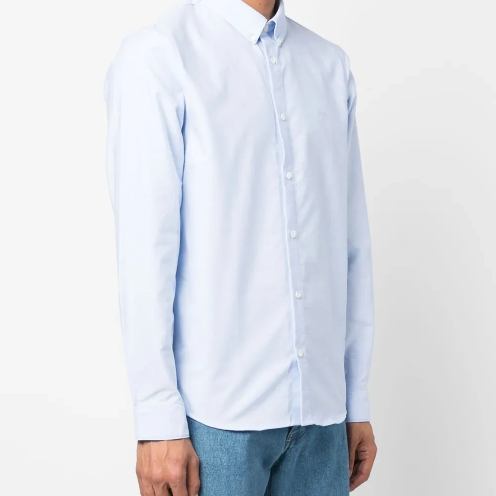 Голубой, хлопок, вышитый логотип на груди, воротник на пуговицах, застежка на пуговицах спереди, длинные рукава, манжеты на пуговицах и закругленный подол.
