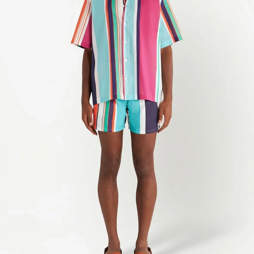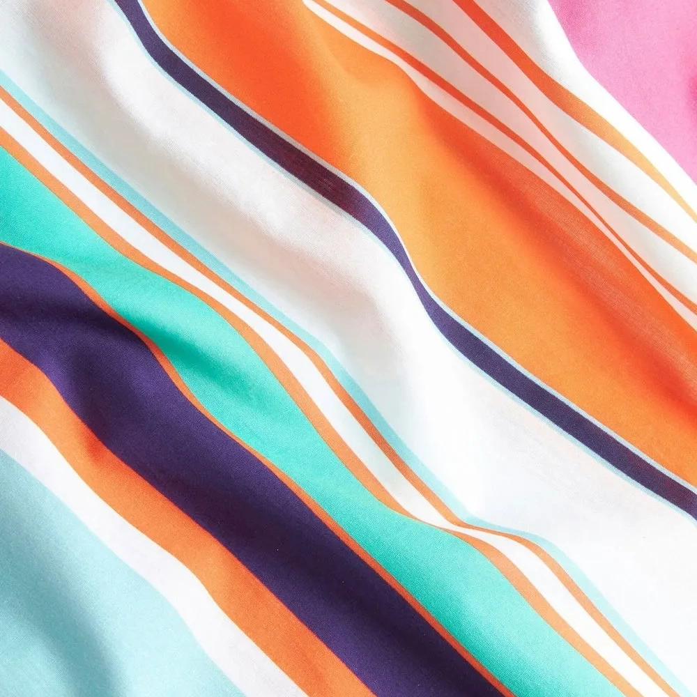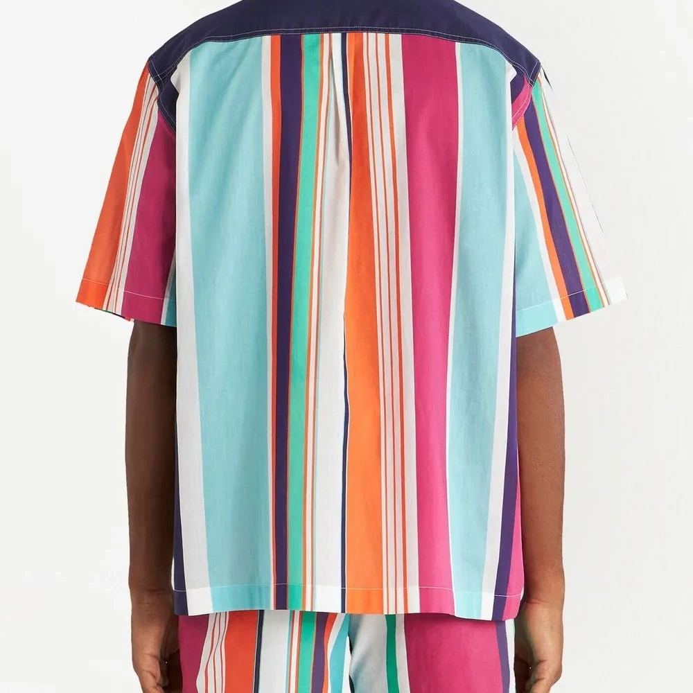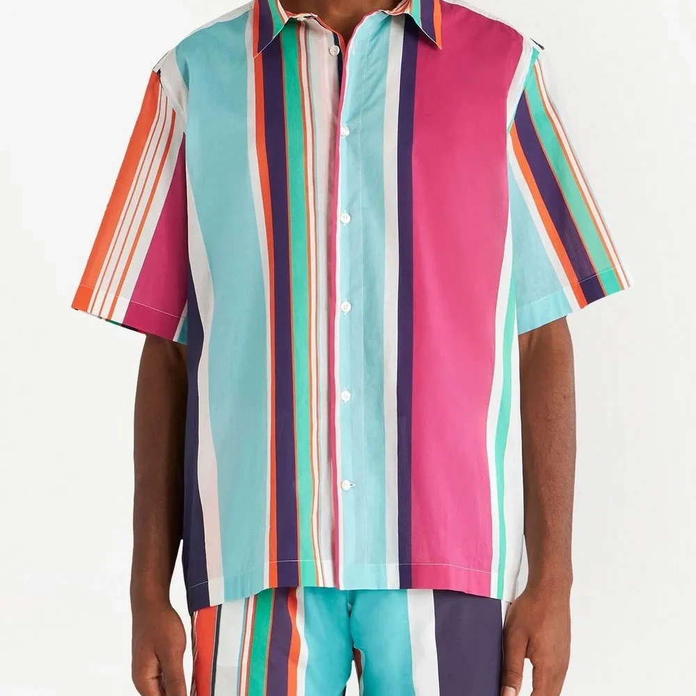 Разноцветный, хлопок, узор в вертикальную полоску, классический воротник, застежка на пуговицах спереди, короткие рукава и прямой подол.