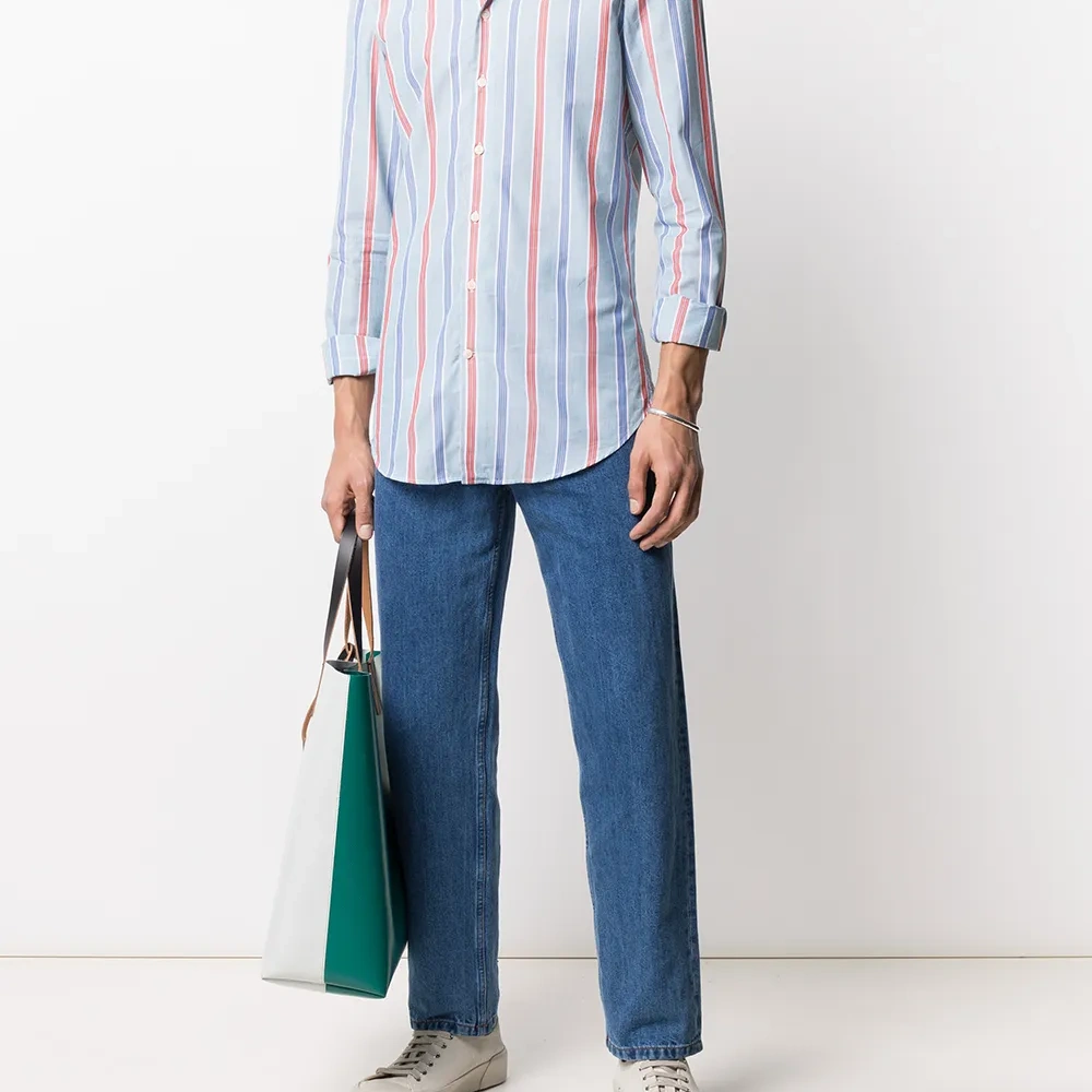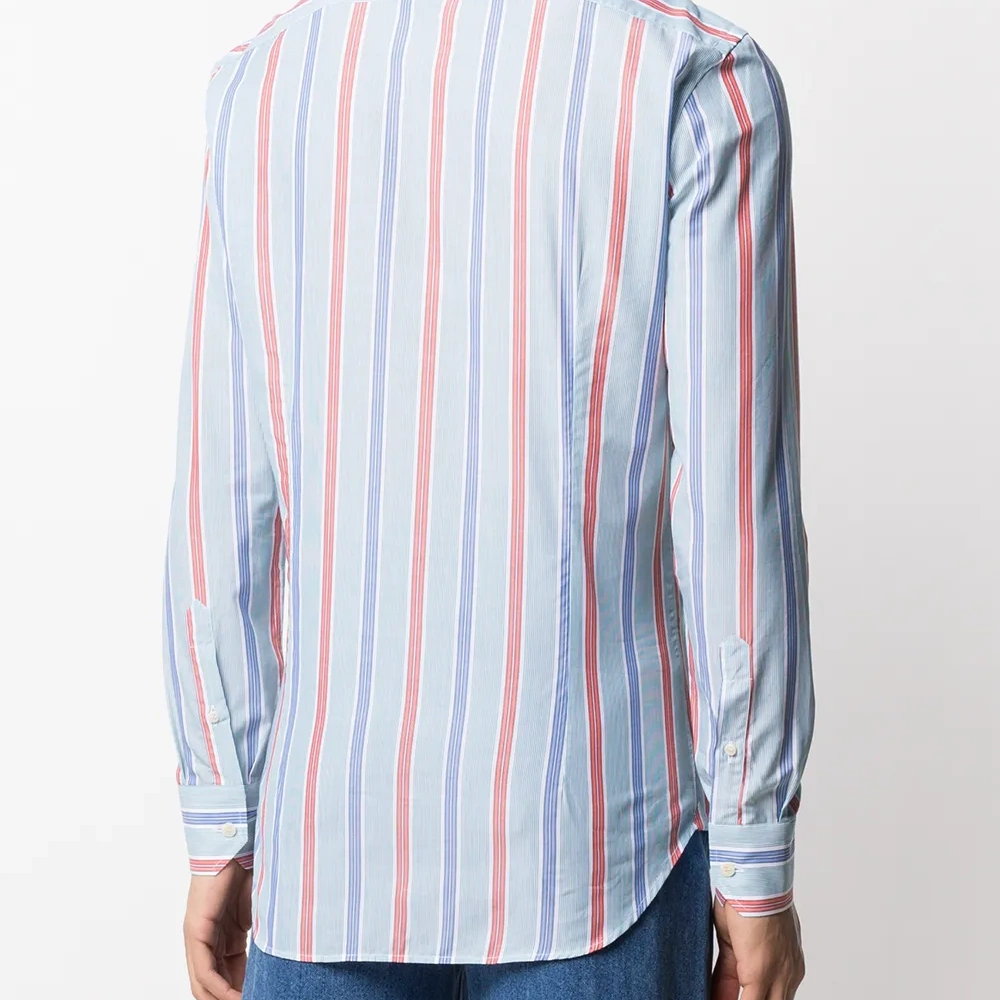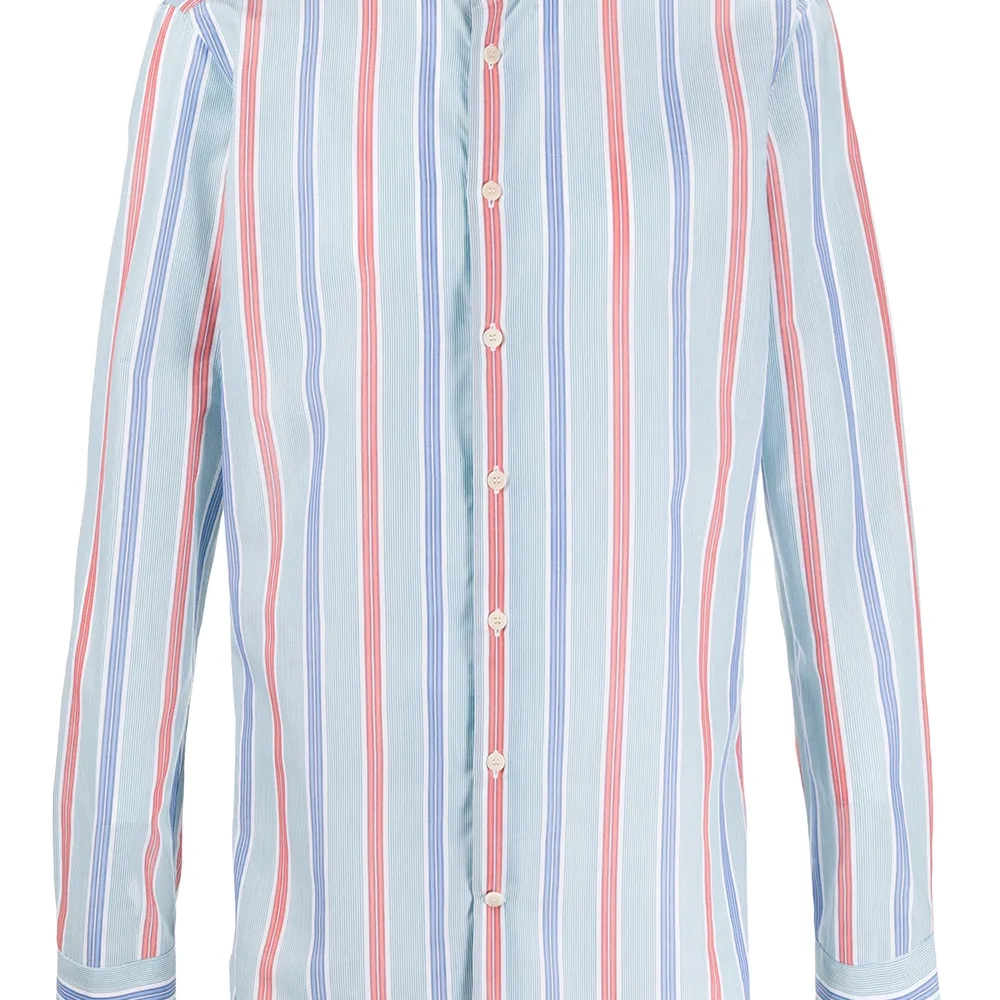Полосатая рубашка с косым воротником от Etro (Этро). Свободный крой, застежка на пуговицах спереди, длинные рукава, манжеты на пуговицах и закругленный подол. Цвет: разноцветный.