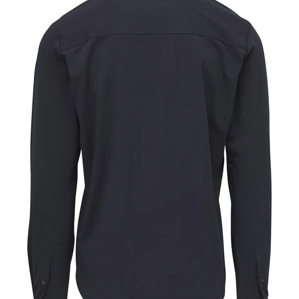 темно-синяя рубашка с застежкой на пуговицы, отложным воротником, длинными рукавами и манжетами на пуговицах