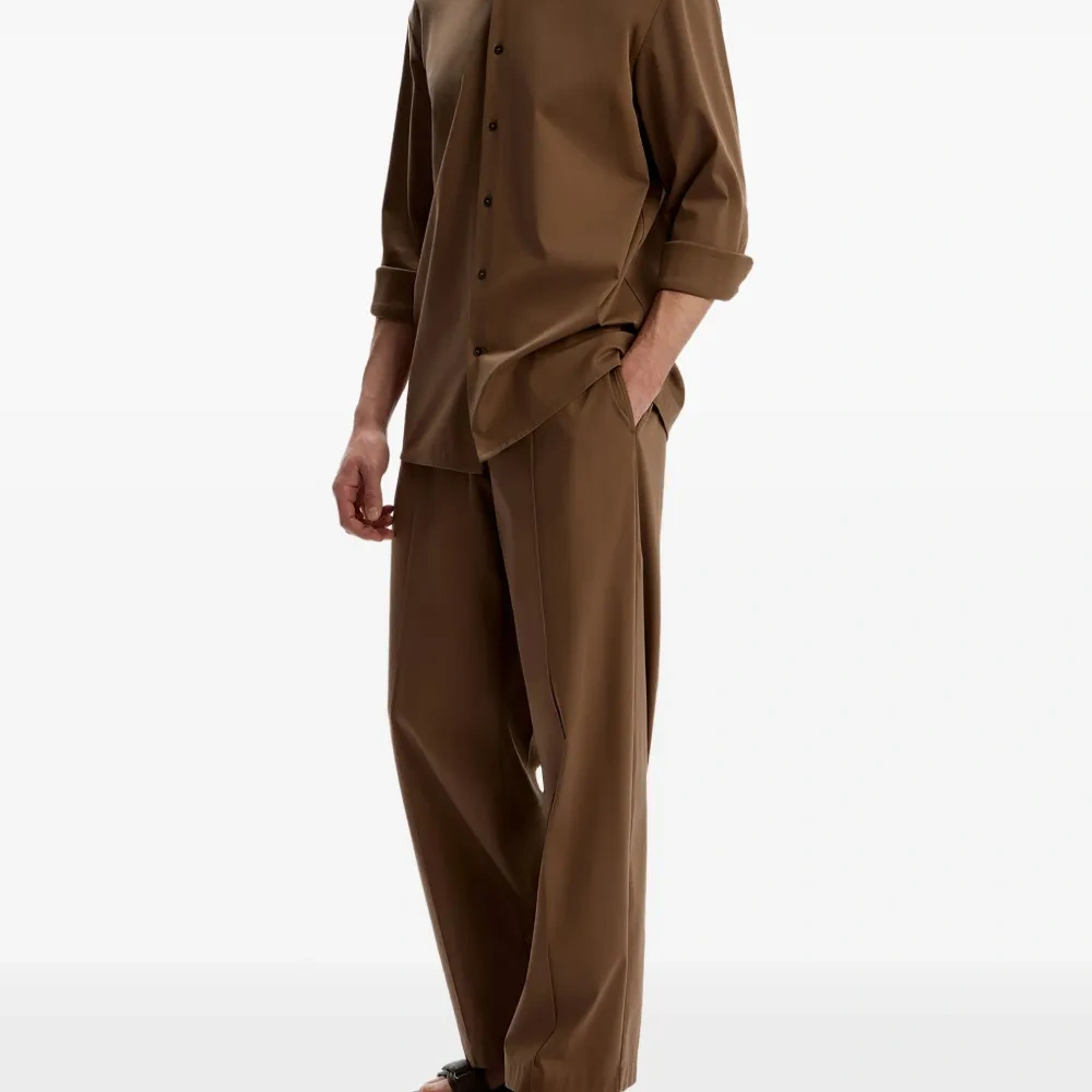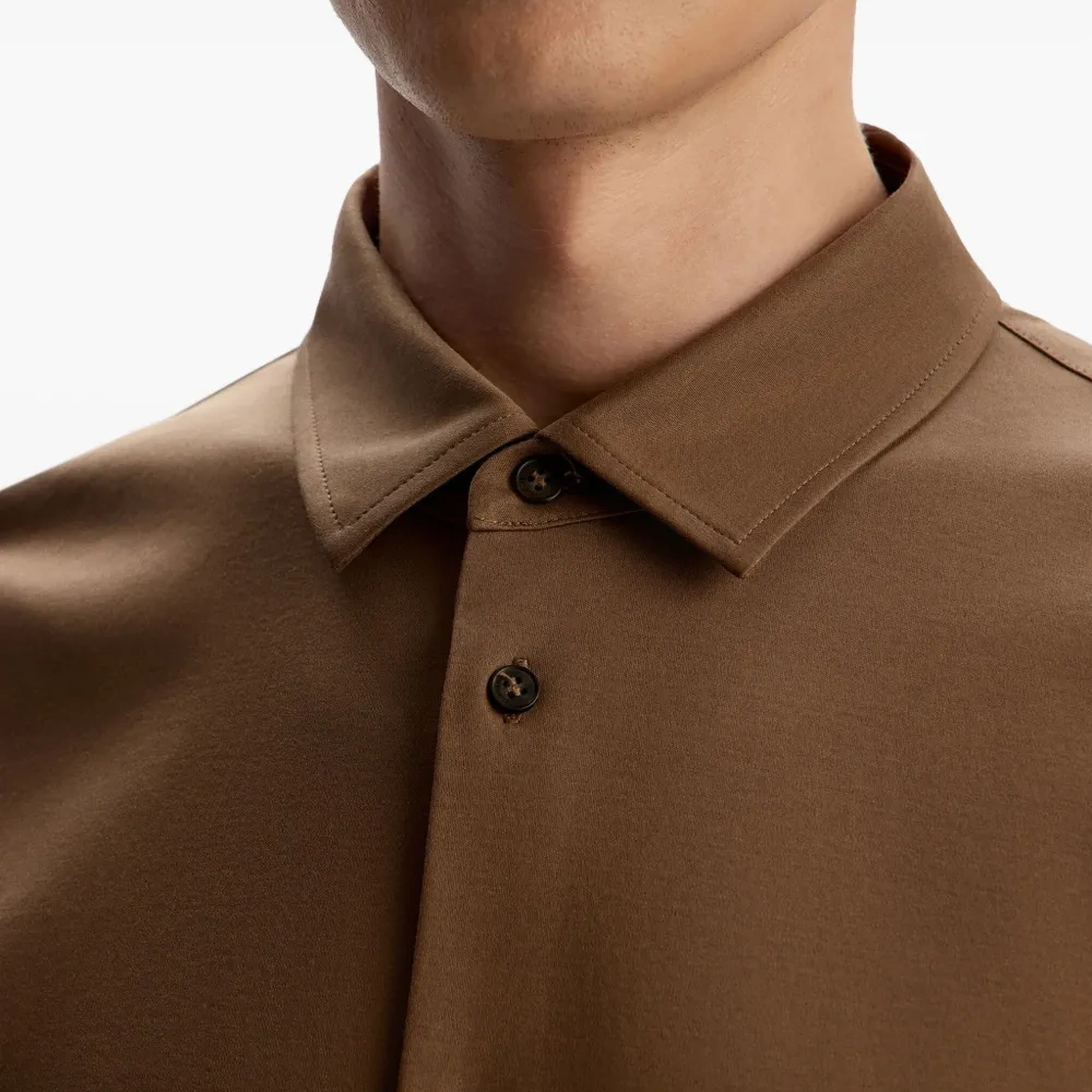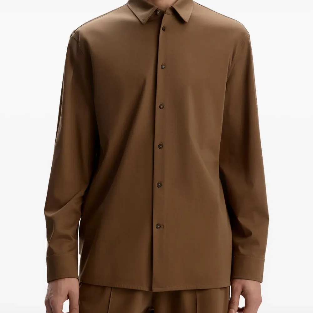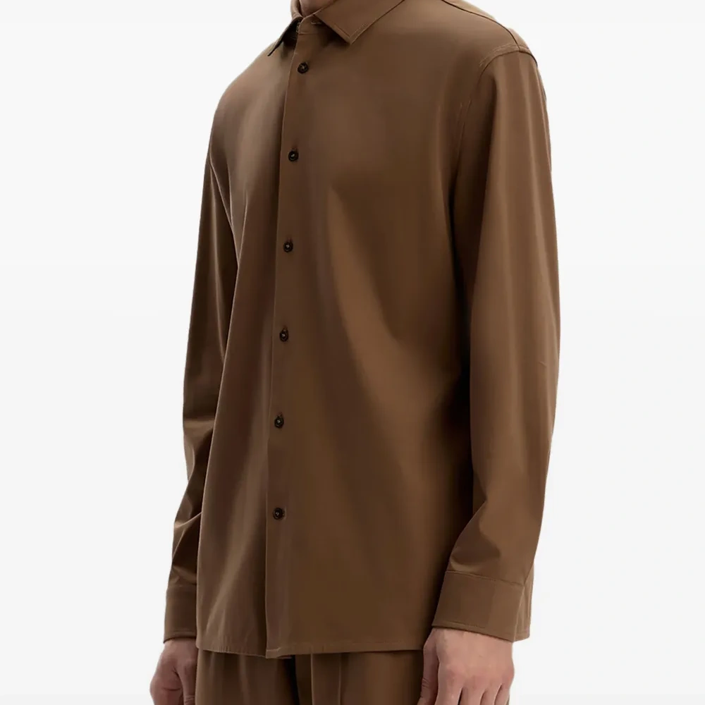 коричневая рубашка с застёжкой на пуговицы, длинными рукавами, отложным воротником, манжетами на пуговицах и кокеткой на спине