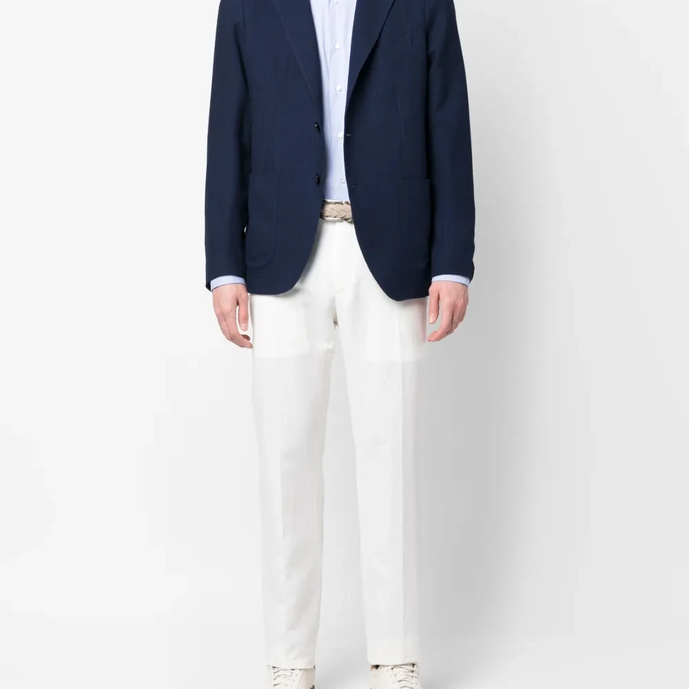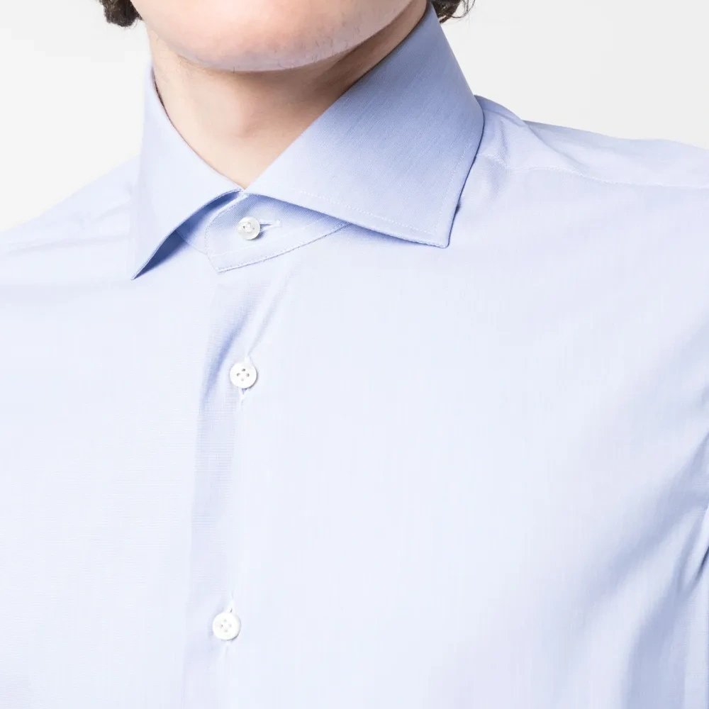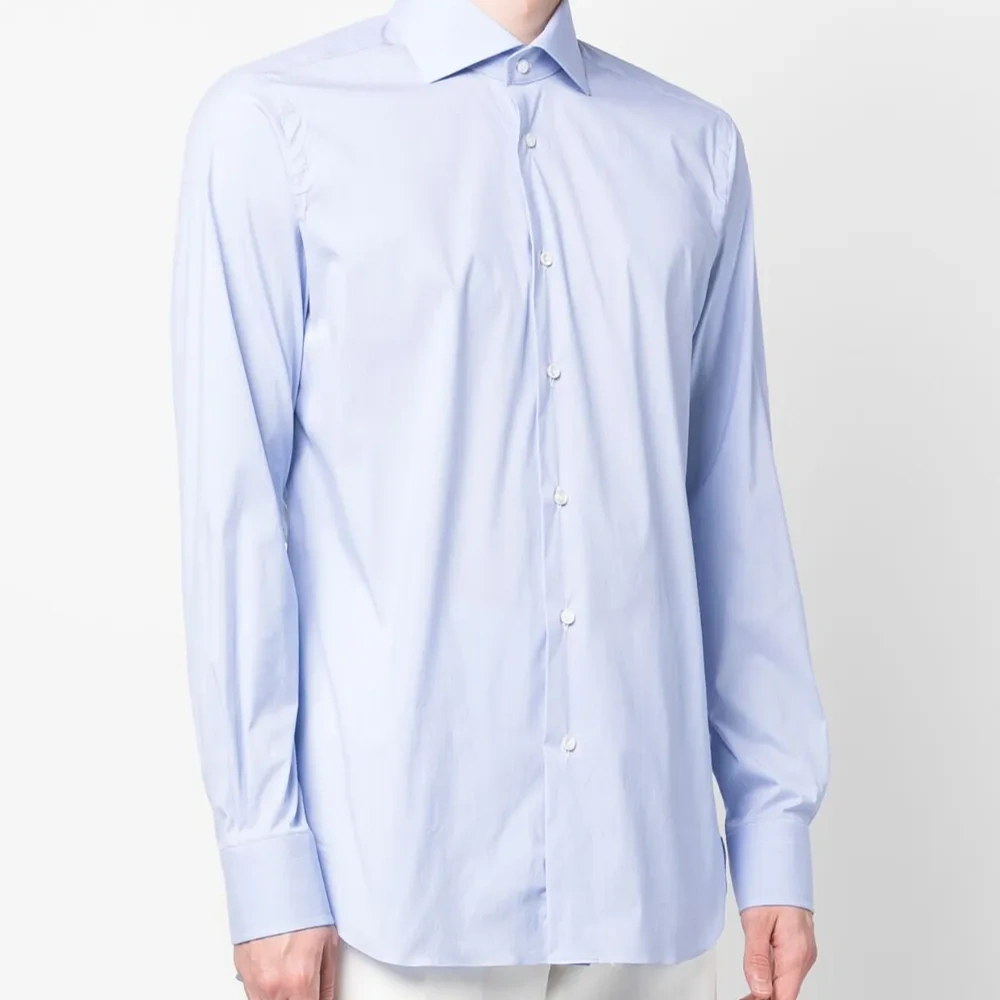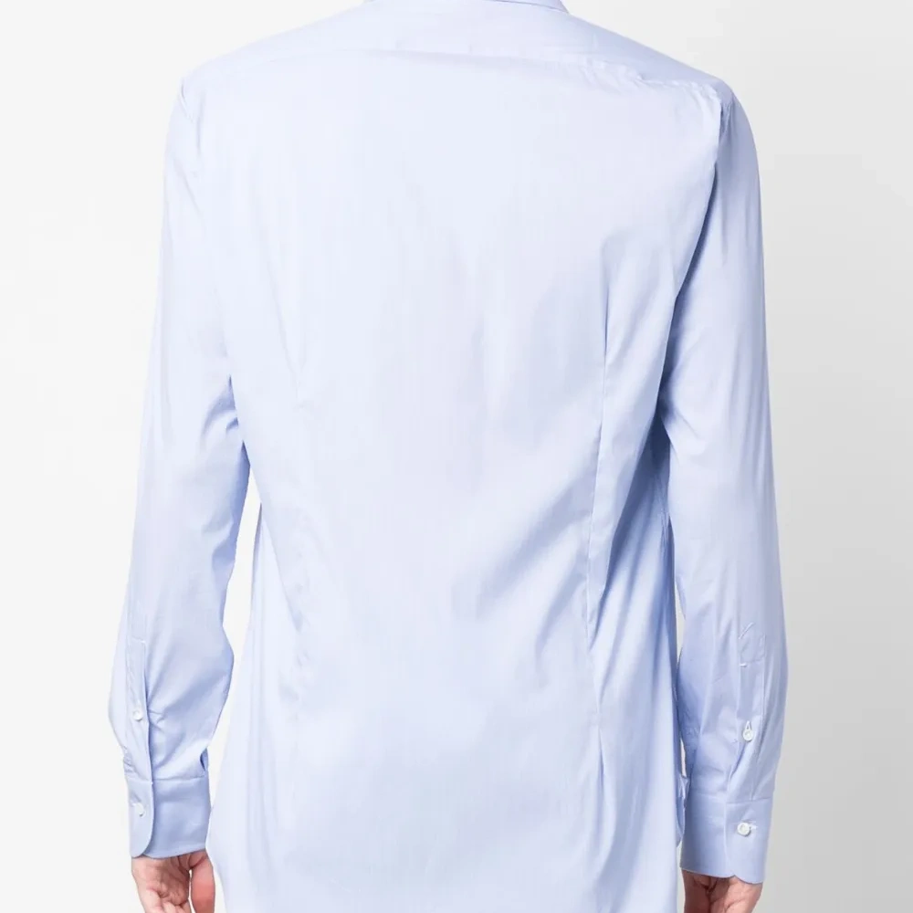 Голубой, эластичный хлопок, плоский заостренный воротник, застежка на пуговицах спереди, длинные рукава, манжеты на пуговицах и закругленный подол сзади.