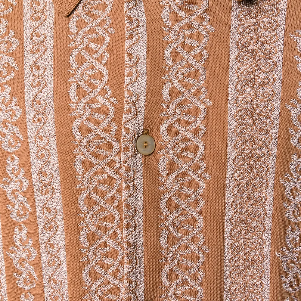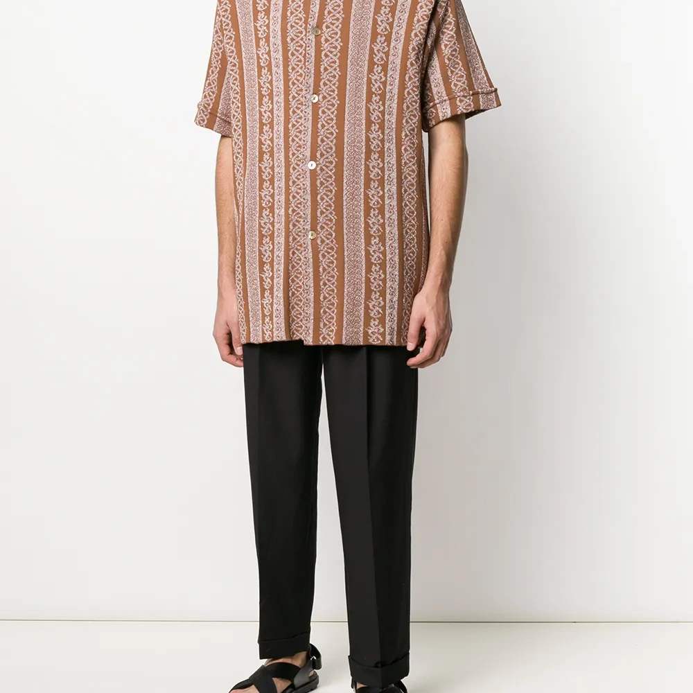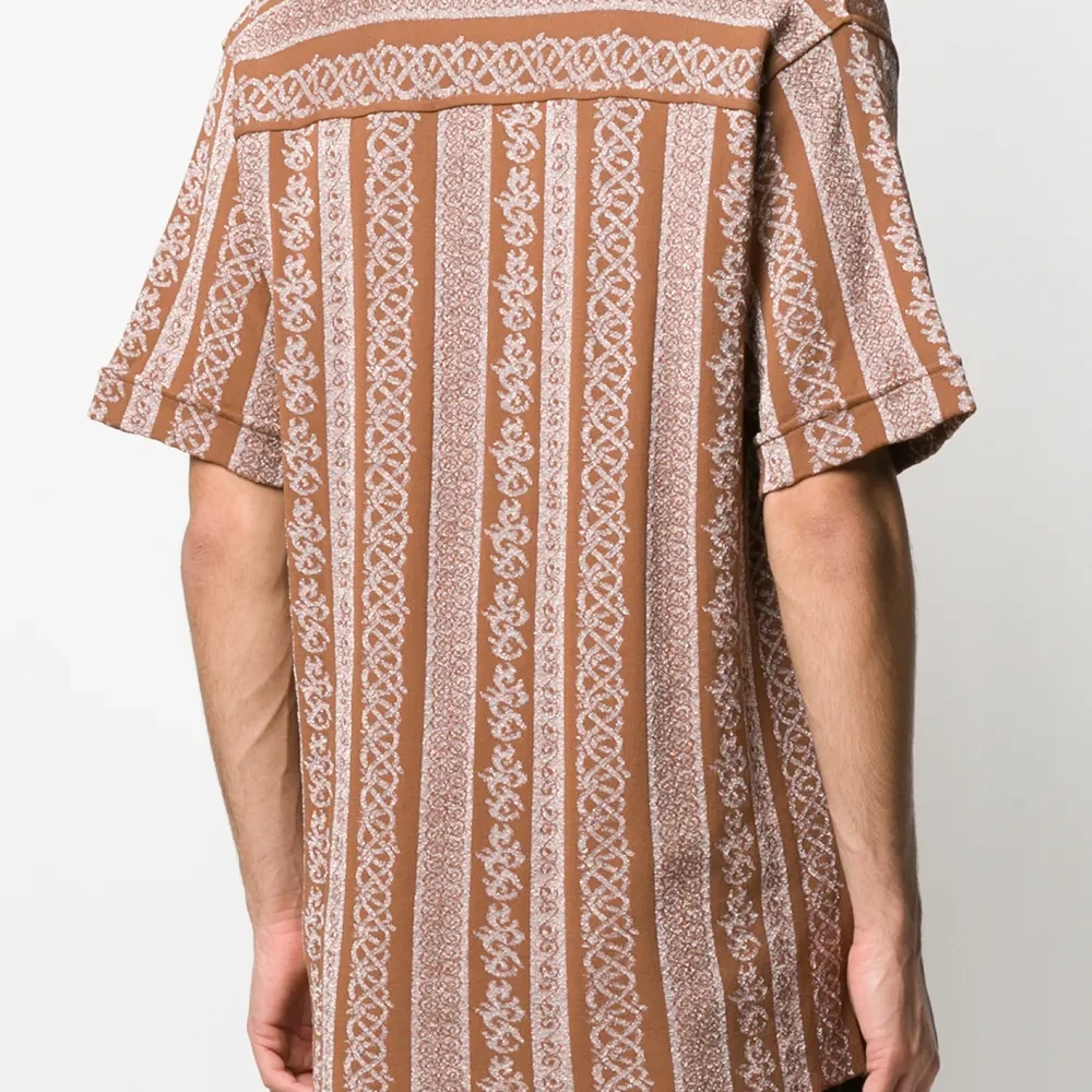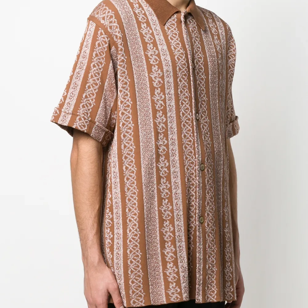 Рубашка свободного кроя со вставками от Magliano. Вязаная модель, вертикальные панели, классический воротник-поло, застежка на пуговицах спереди, короткие рукава, свободный крой и прямой подол.
