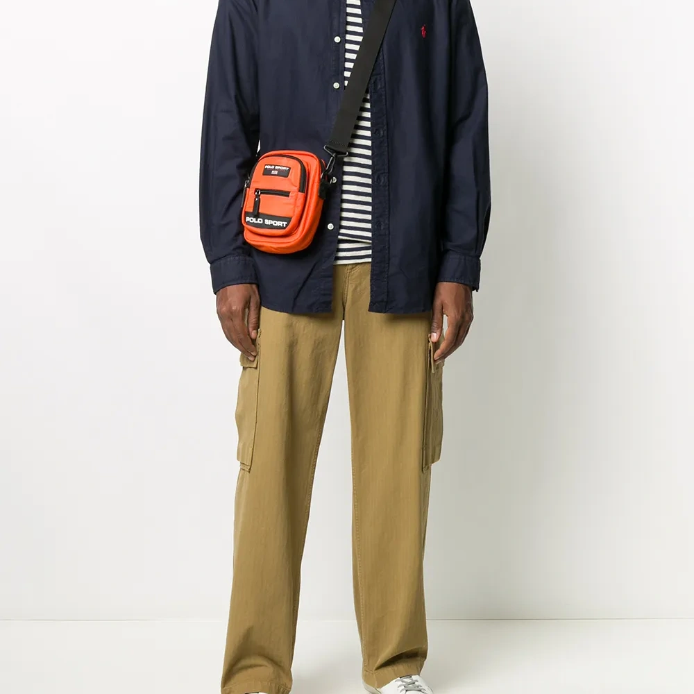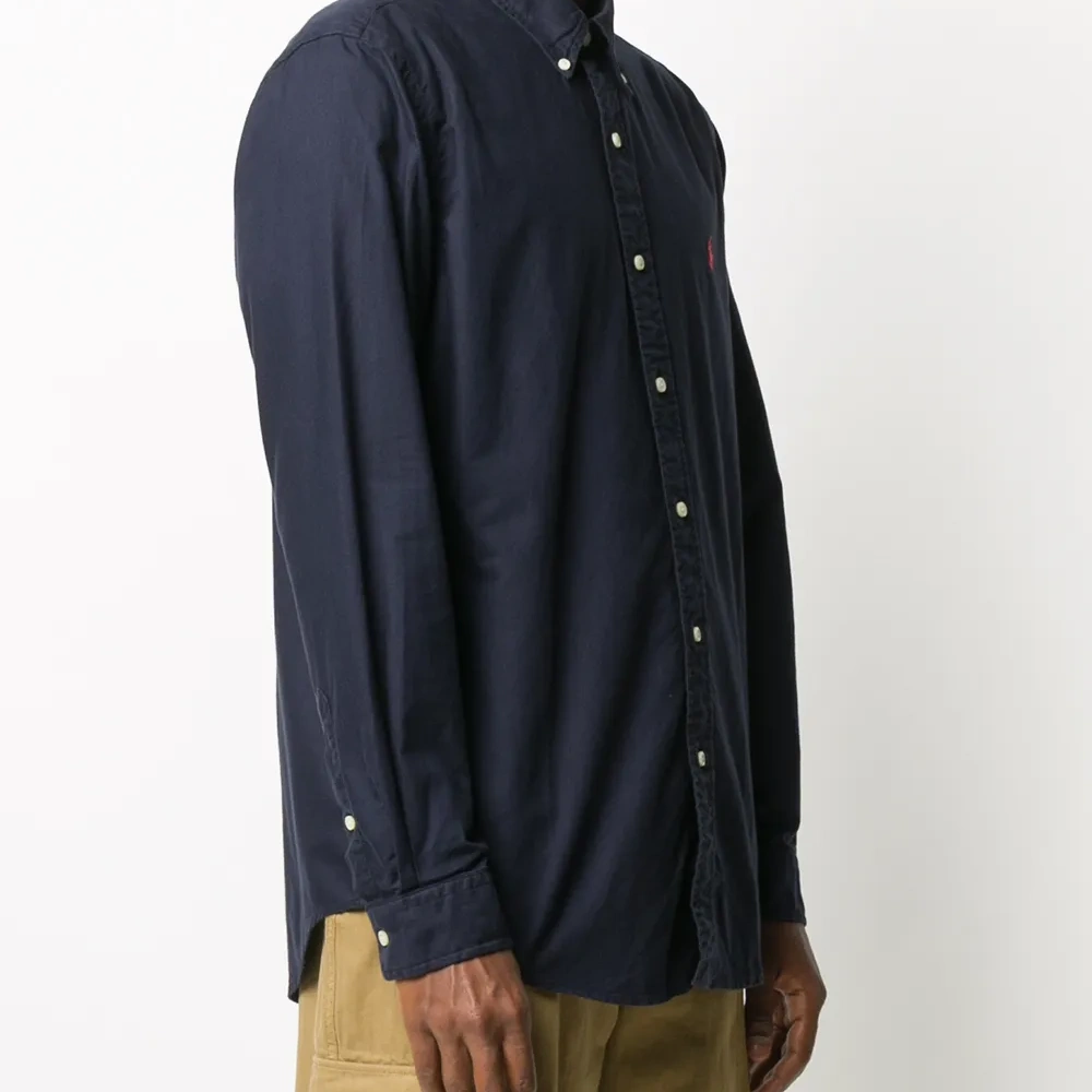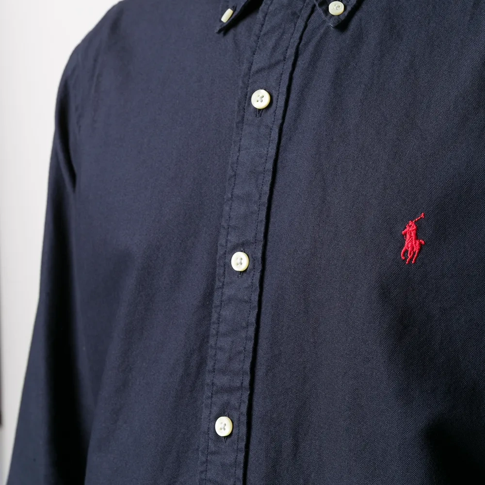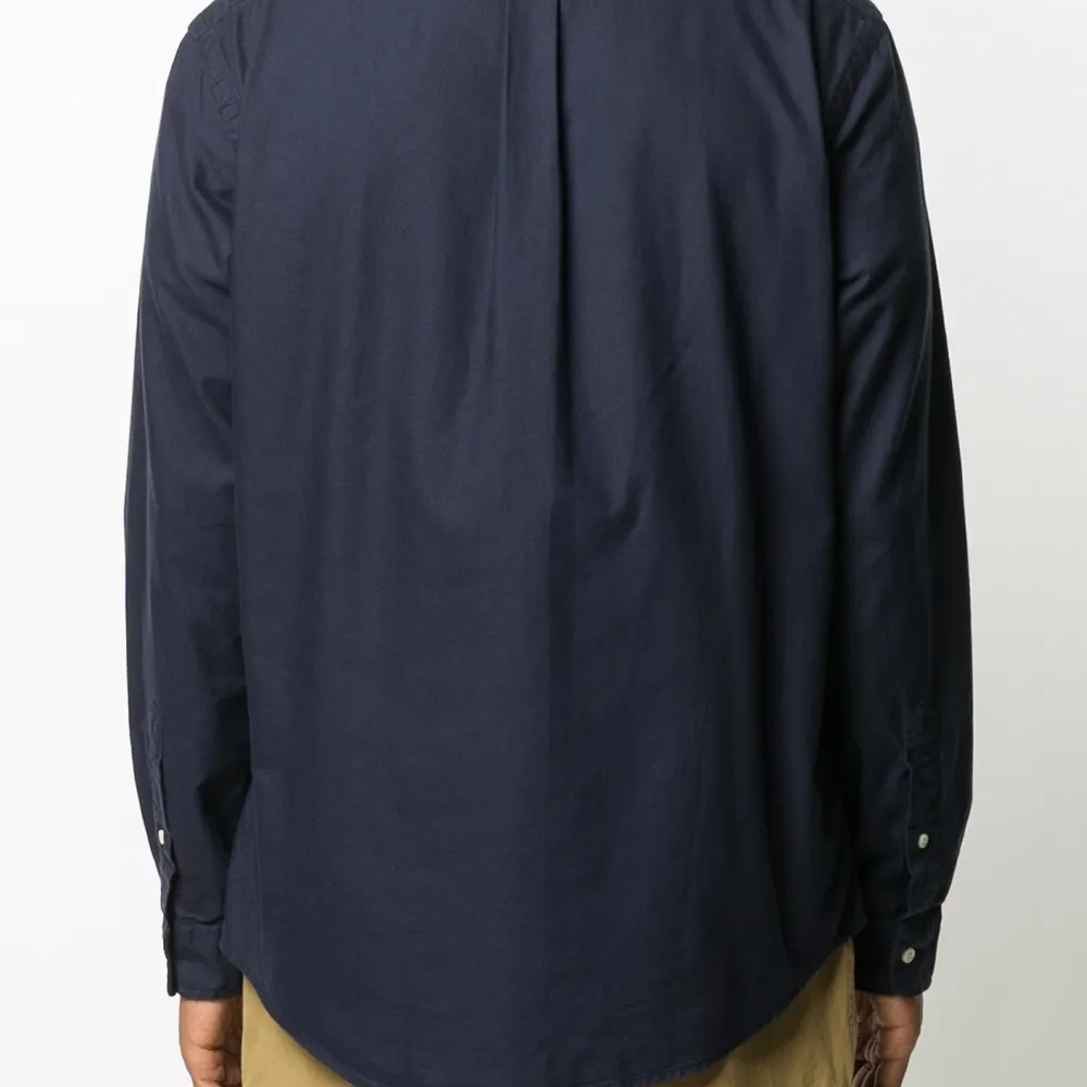 Воротник на пуговицах, вышитый логотип на груди, застежка на пуговицах спереди, длинные рукава, рукава с манжетами на пуговицах и закругленный подол.