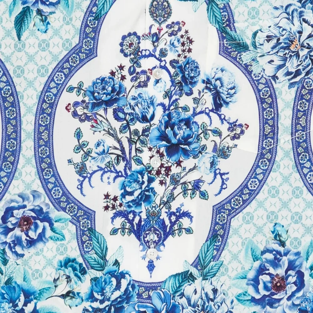 белая рубашка с цветочным принтом, короткими рукавами, отложным воротником и застёжкой на пуговицы