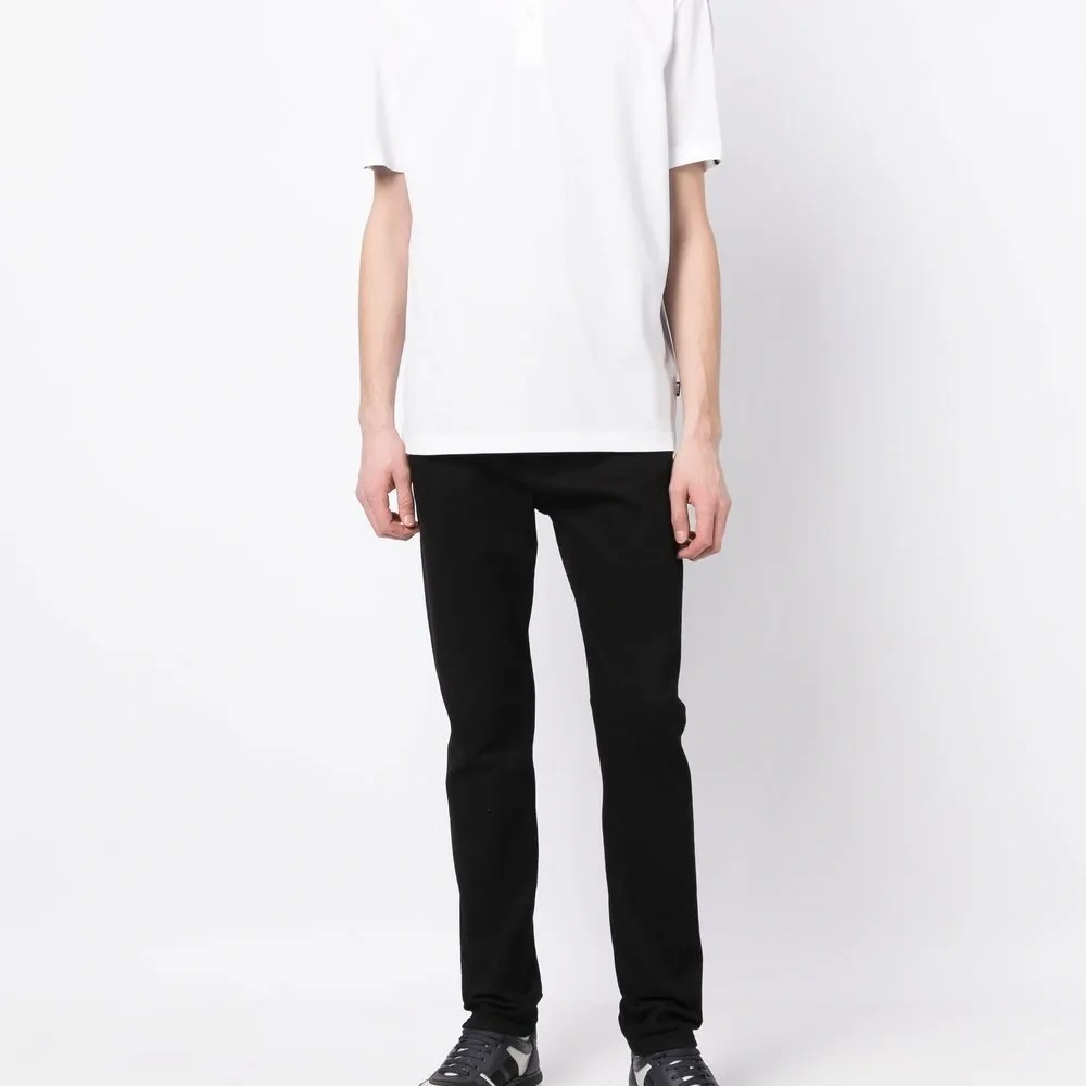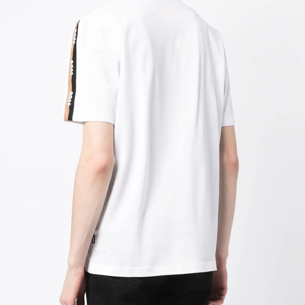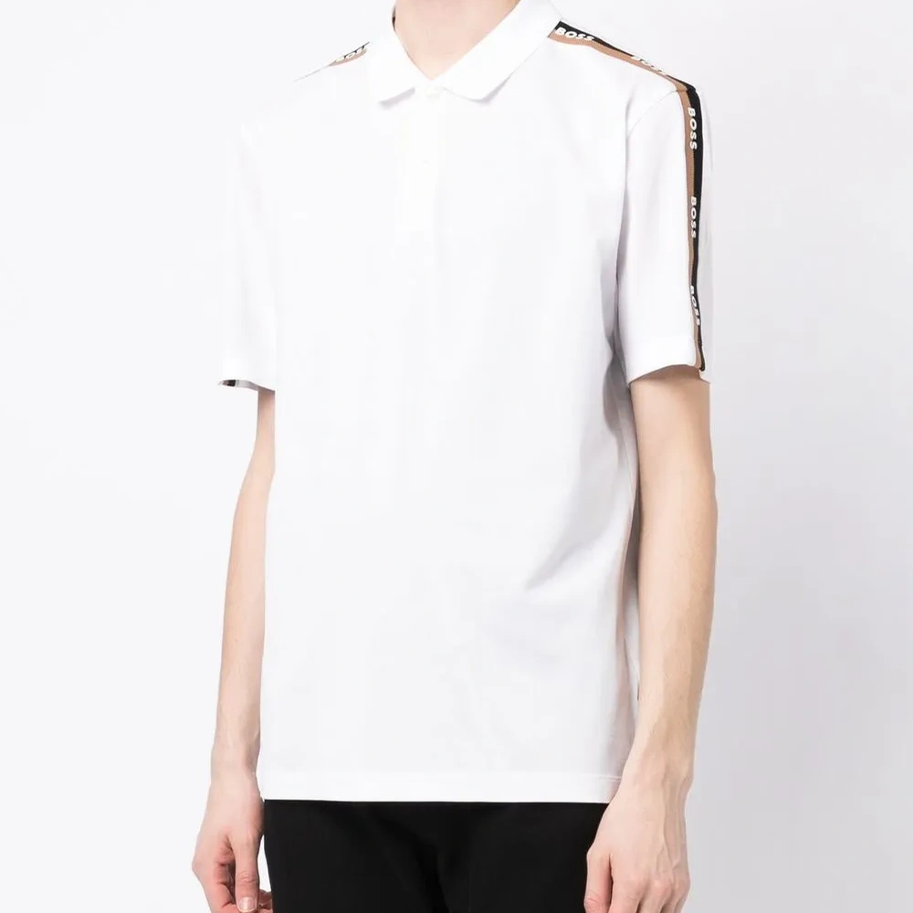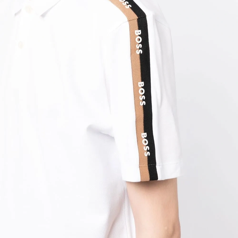 Белый, смесовый хлопок, полоска сбоку, воротник поло, короткие рукава и прямой подол.