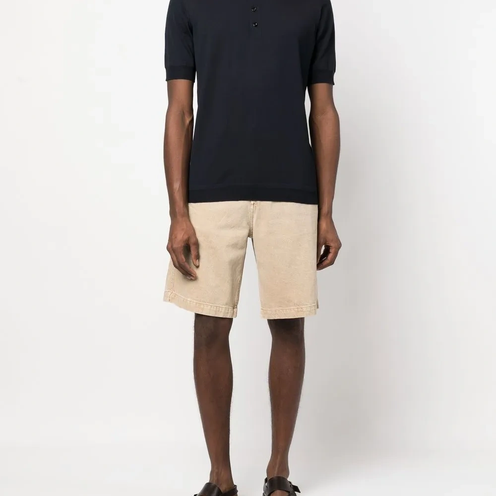 Темно-синий, шерсть мериноса, воротник поло, короткая застежка на пуговицах спереди, короткие рукава и прямой подол.