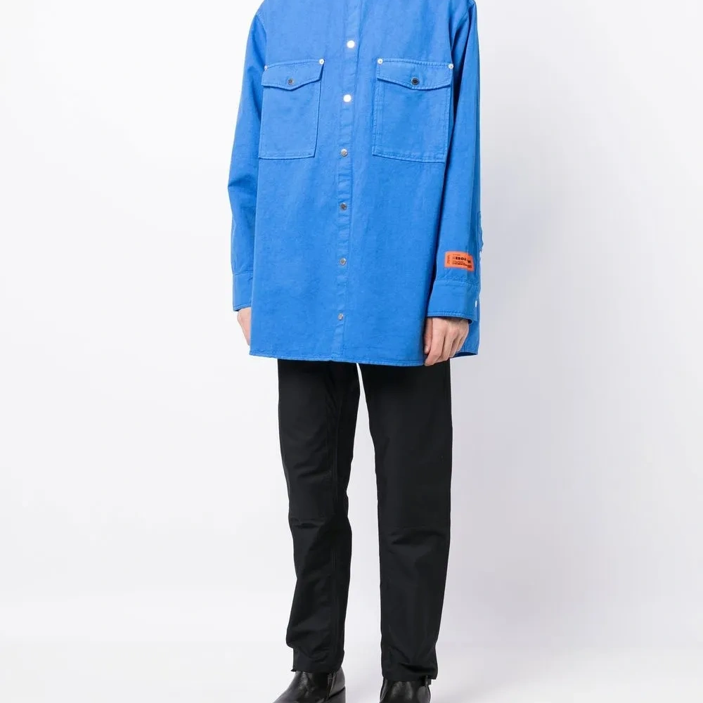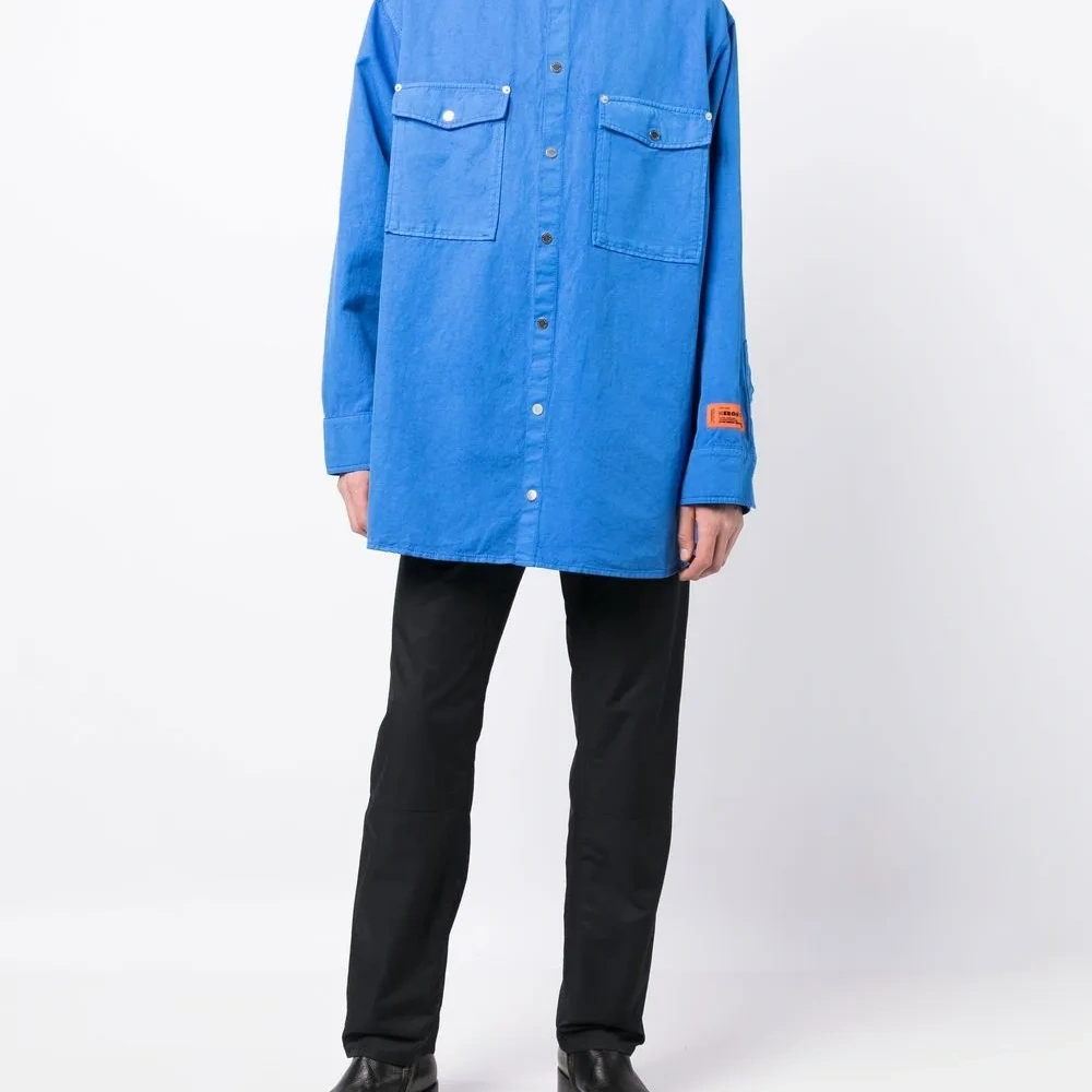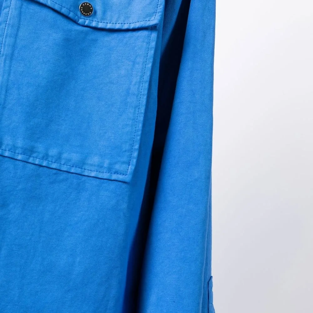 Синий, смесь хлопка и льна, нашивка с логотипом на рукаве, классический воротник, приспущенные плечи, передние карманы с клапаном, застежка на пуговицах спереди и прямой подол.