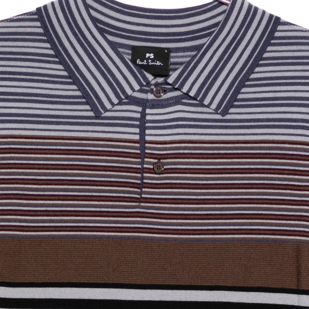 фиолетовые горизонтальные полосы, длинные рукава, воротник поло, застежка на пуговицы, манжеты в рубчик