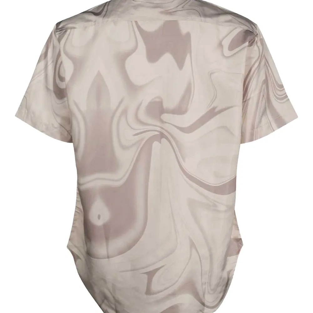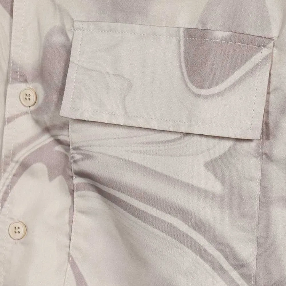 бежевый узор с завитками короткие рукава закругленный подол застежка на пуговицы нагрудные карманы с клапанами